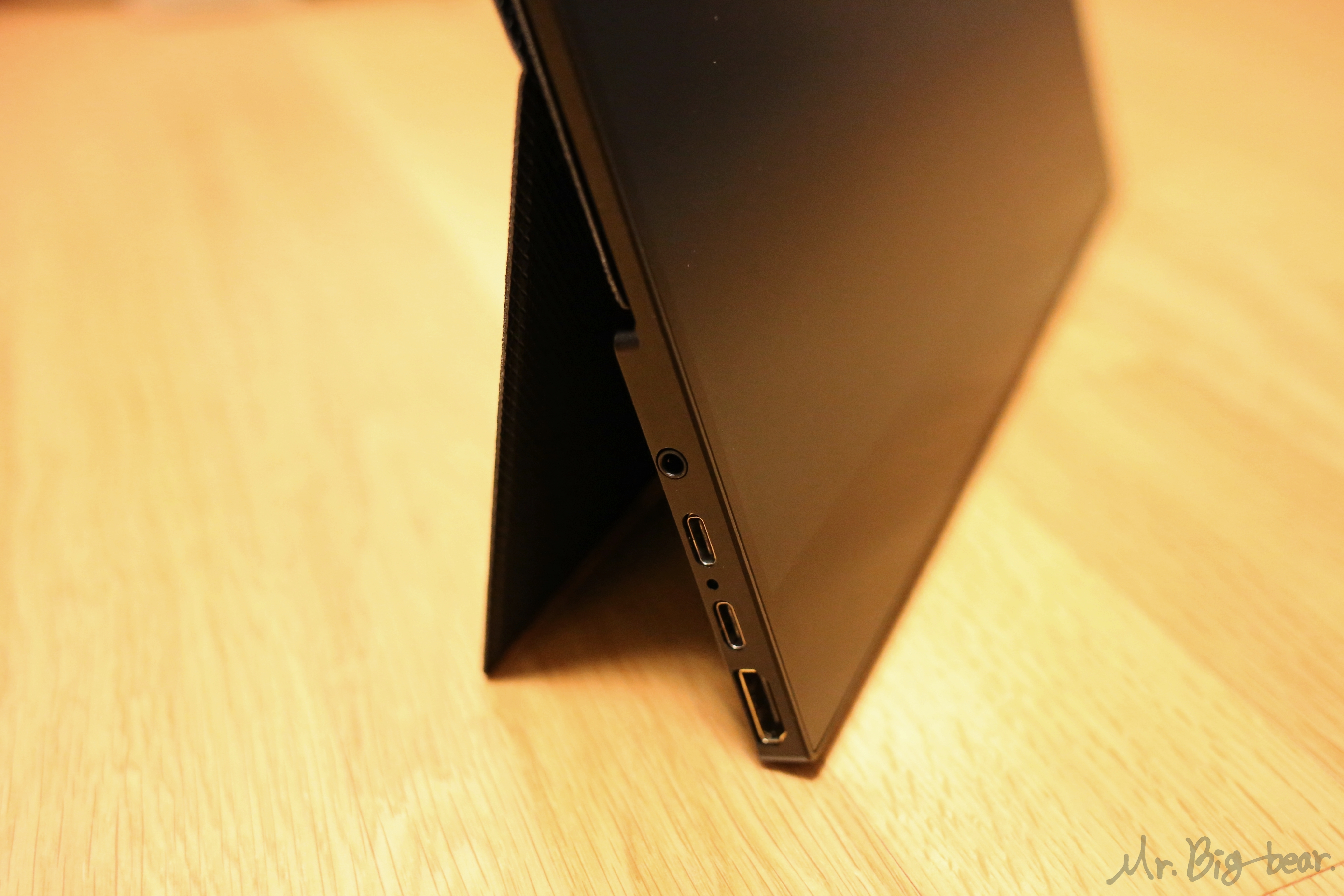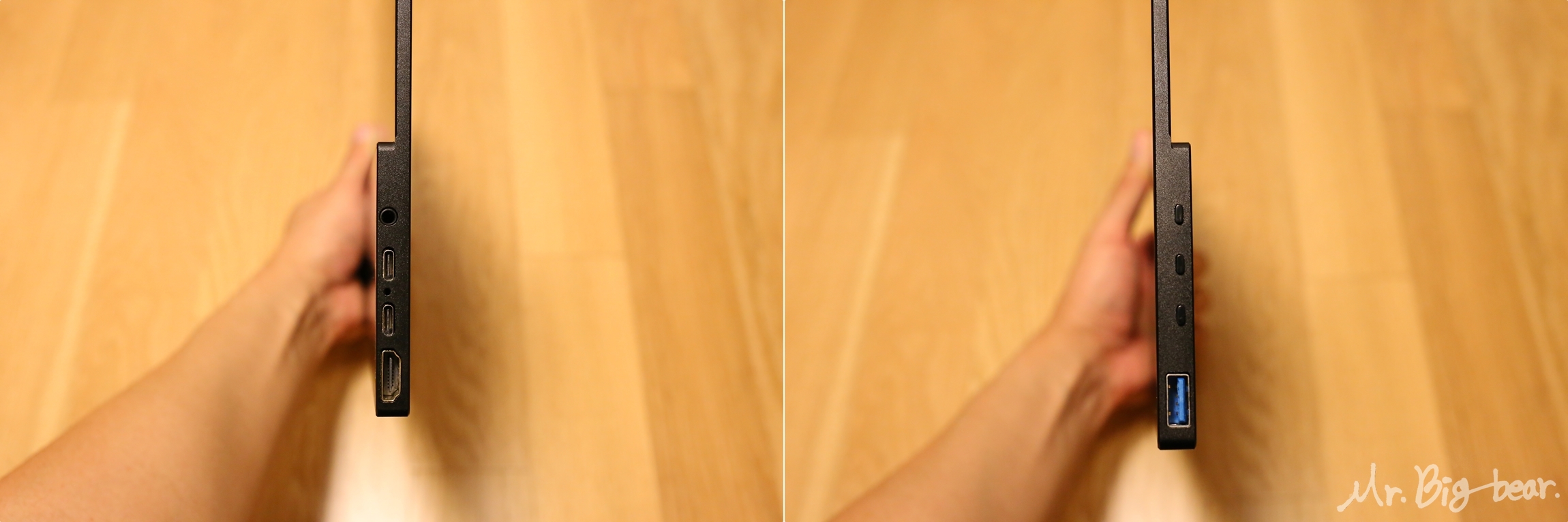 모니터라는 출력 장치에서 가장 중요한 입/출력 단자입니다. 3.5mm 이어폰(헤드폰), USB-C 전원, USB-C 데이터, HDMI 단자 모두 제품을 바라볼때 좌측에 있으므로 사용하시는 환경을 잘 생각하시어 구매하시는게 좋습니다. 우측에 있는 USB 단자는 키보드/마우스를 연결해서 사용할 수 있으니 노트북처럼 활용할때는 좋을 것 같습니다.