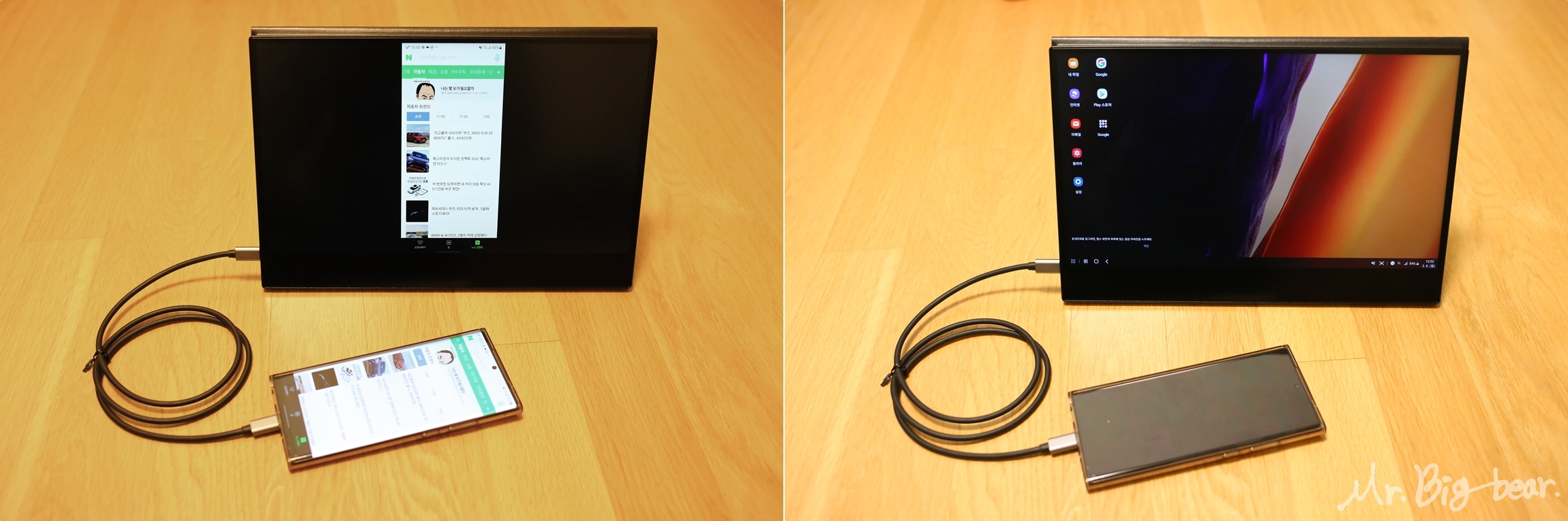결론적으로, 외부 전원없이도 스마트폰에 USB-C 타입 케이블 연결시 미러링 및 덱스 모두 정상적으로 출력됩니다. 다만, 13인치 모니터를 작동시켜야하니 스마트폰의 배터리 소모량은 적지 않을것으로 추정됩니다.
