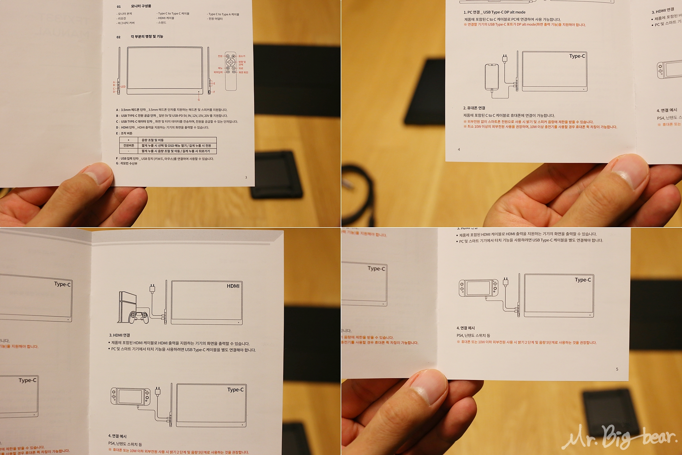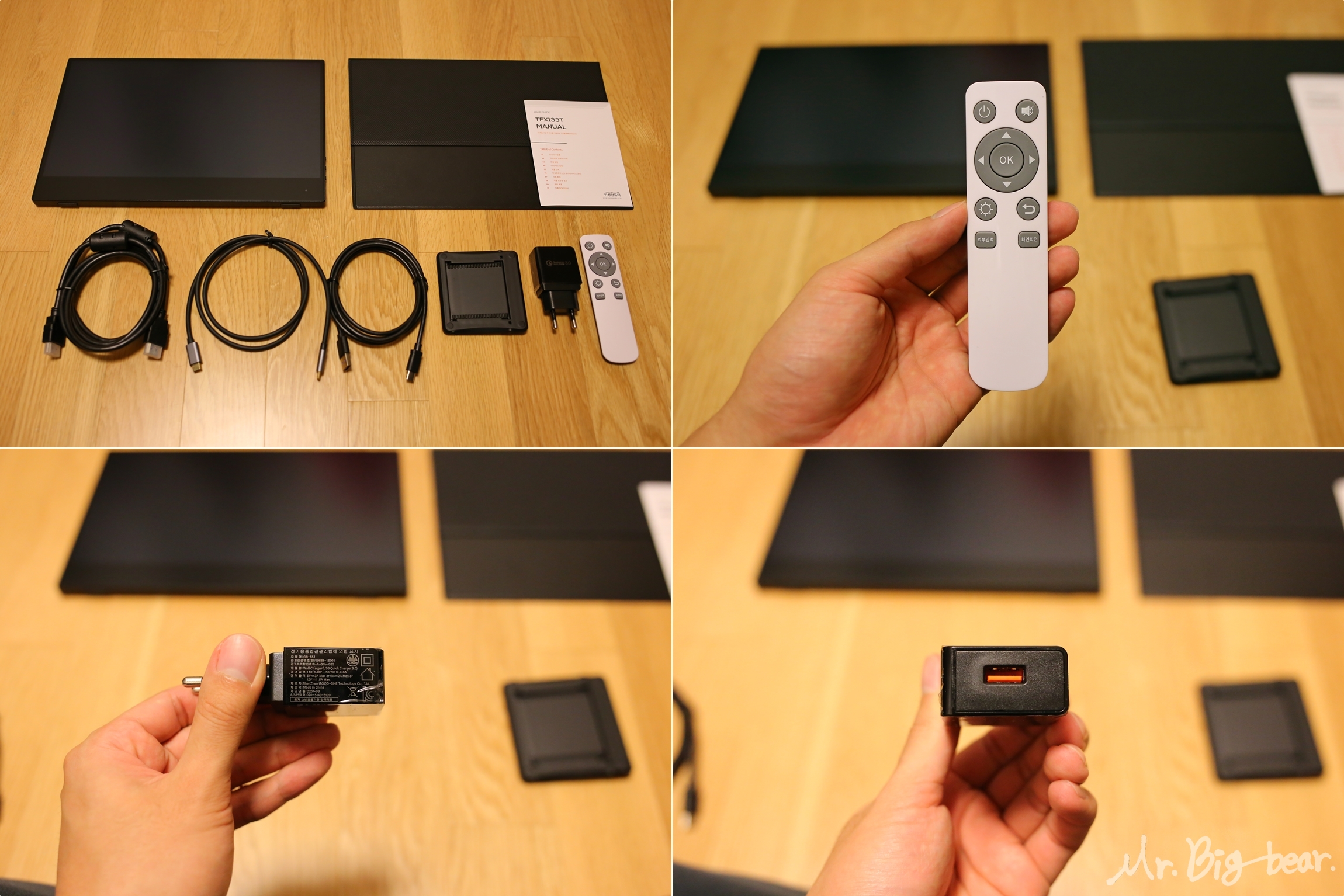 모니터 케이스, HDMI 및 C to C 케이블, 전원(케이블), 받침대 그리고 리모컨이 있습니다. PC용 모니터를 구입해도 리모컨은 드문데, 휴대용 모니터에 리모컨을 주는게 꽤 특이합니다. 다만, 4개월 넘는 사용기간 동안 리모컨은 한번도 사용한적이 없어서 그냥 삭제하고 가격이나 낮춰주는게 더 좋을 것 같습니다. USB 타입의 전원 출력은 5V-3A, 9V-2A, 12V-1.5A 이므로 다른 충전기로 사용하실 분들은 정격출력 확인하시기 바랍니다.
