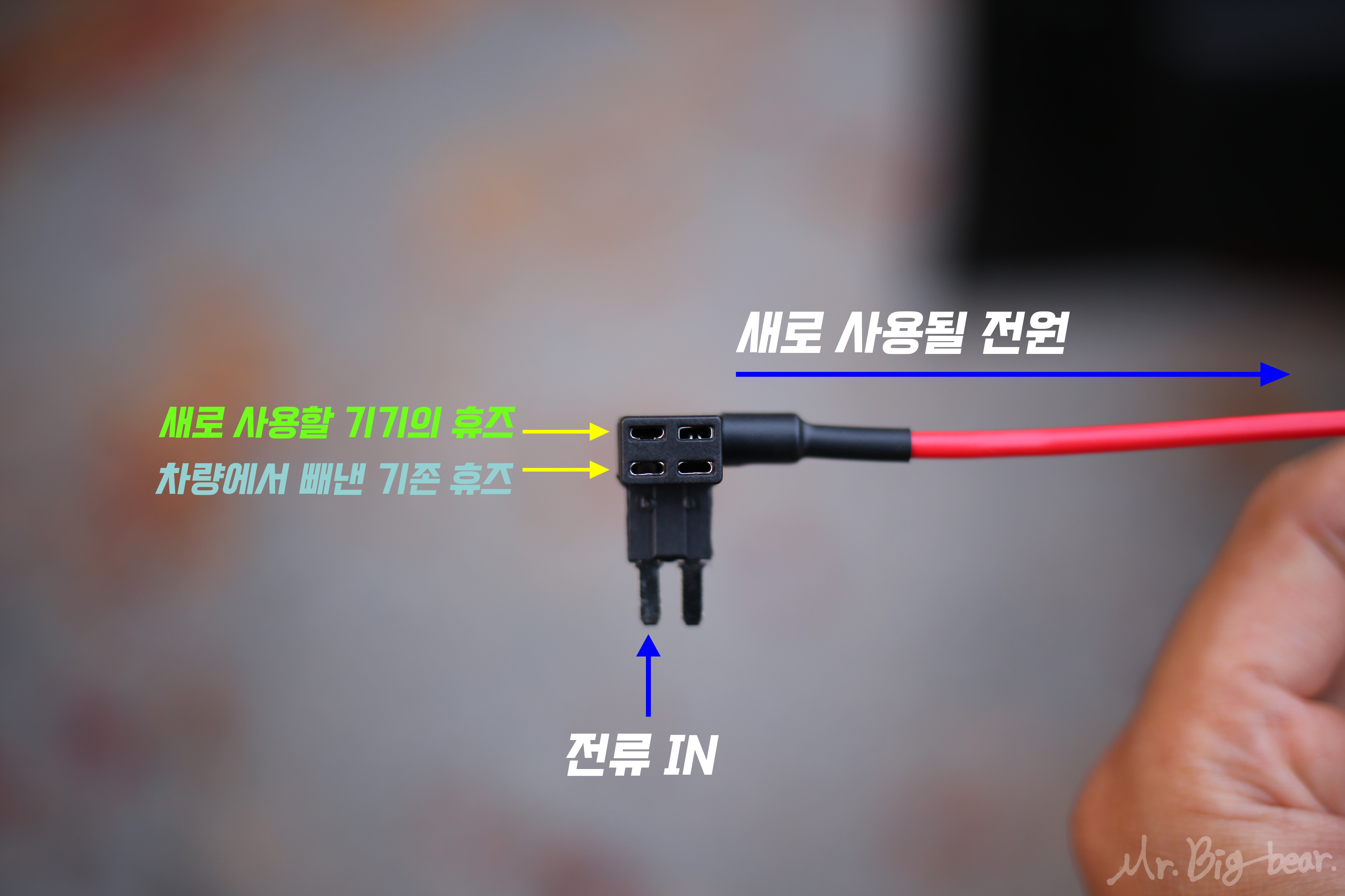 여기서 잠깐! 제 블로그에서 "듀얼 휴즈 홀더" 를 사용한 작업은 처음인 것 같습니다. 휴즈 홀더는 휴즈 다리에 배선을 감아 사용하면서 발생하는 쇼트나 합선등 사고를 방지하고, 안정적으로 전원을 연결해주기 위해 사용하는 제품입니다. 듀얼 휴즈 홀더 사용법에 대해 설명하면, 앞서 검전기로 전원이 인입되는 곳을 확인해주고 휴즈 홀더의 전류 IN 위치에 맞춰 끼워줍니다. 휴즈 자리에는 기존에 차량에서 빼낸 휴즈와 새로 사용할 기기의 휴즈를 꽂아주고 전원 배선을 연결해주면 끝입니다. 간단하죠?