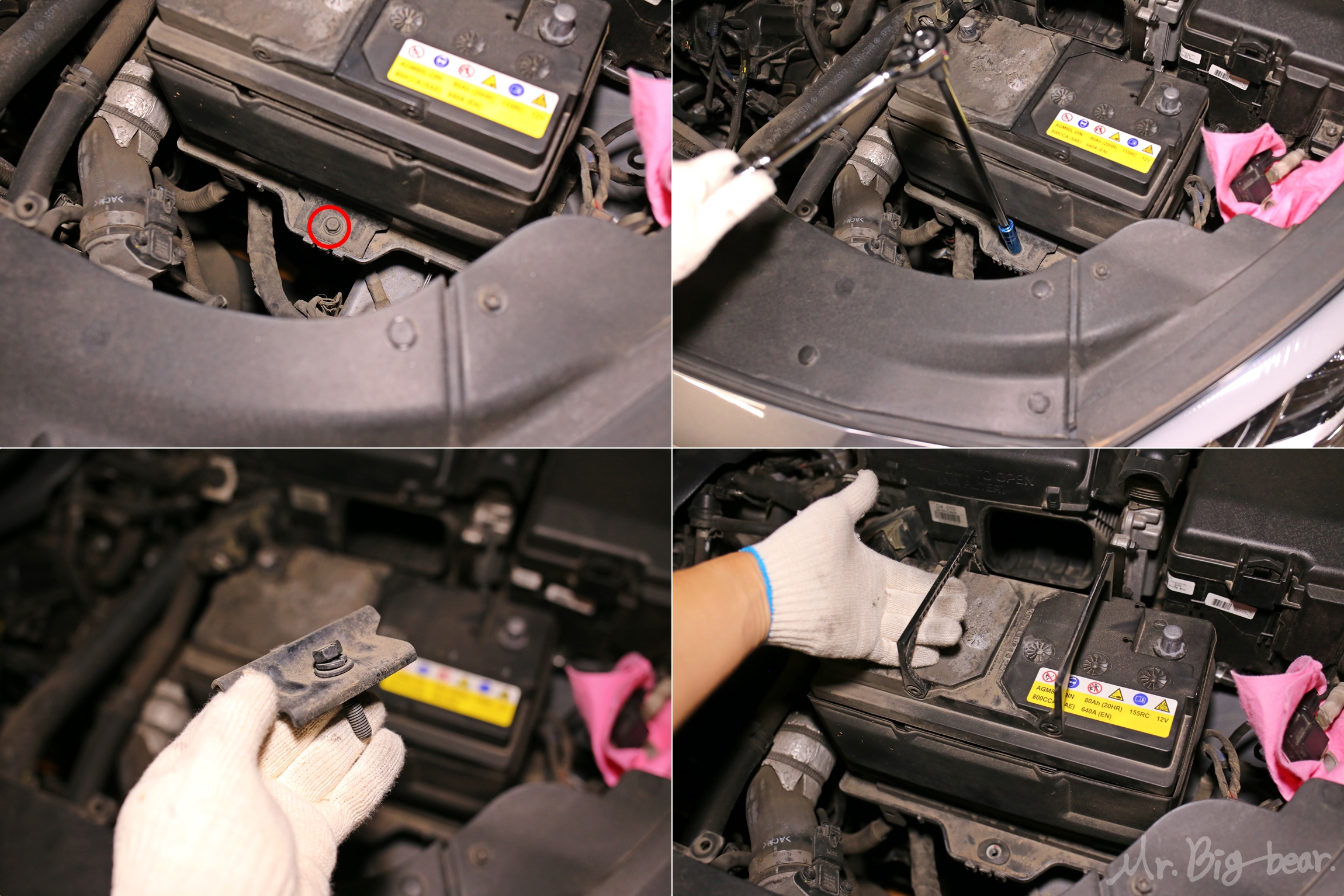 이제 아랫쪽에 숨겨진 배터리 마운팅 브라켓을 탈거해야 하는데, 차종마다 상이하나 보통 12mm 볼트로 체결되어 있습니다. 위치가 꽤 깊어서 30cm 이상 익스텐션으로 연장해서 작업해야 합니다. 탈거한 브라켓은 볼트와 같이 한켠에 잘 챙겨놓고, 배터리 상단의 손잡이를 세워서 잡고 밖으로 들어냅니다. 80Ah 배터리 기준으로 중량이 15kg 전후이므로 허리 다치지 않도록 조심 또 조심합니다.