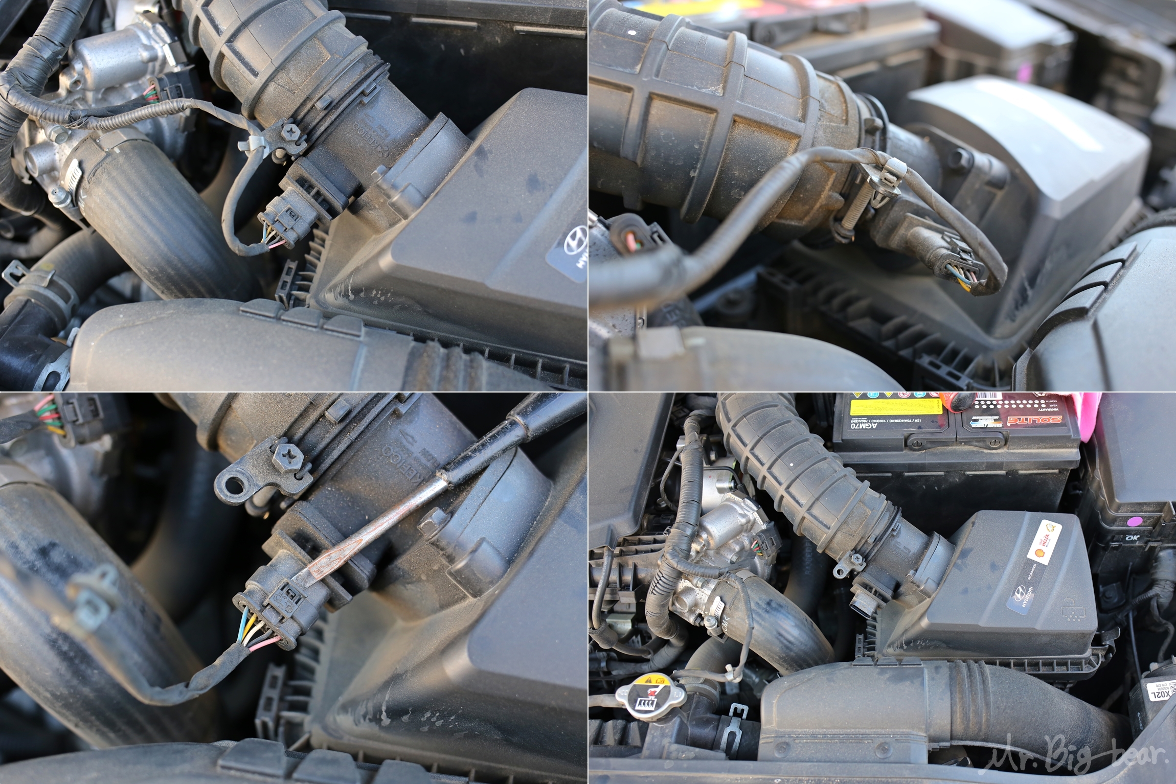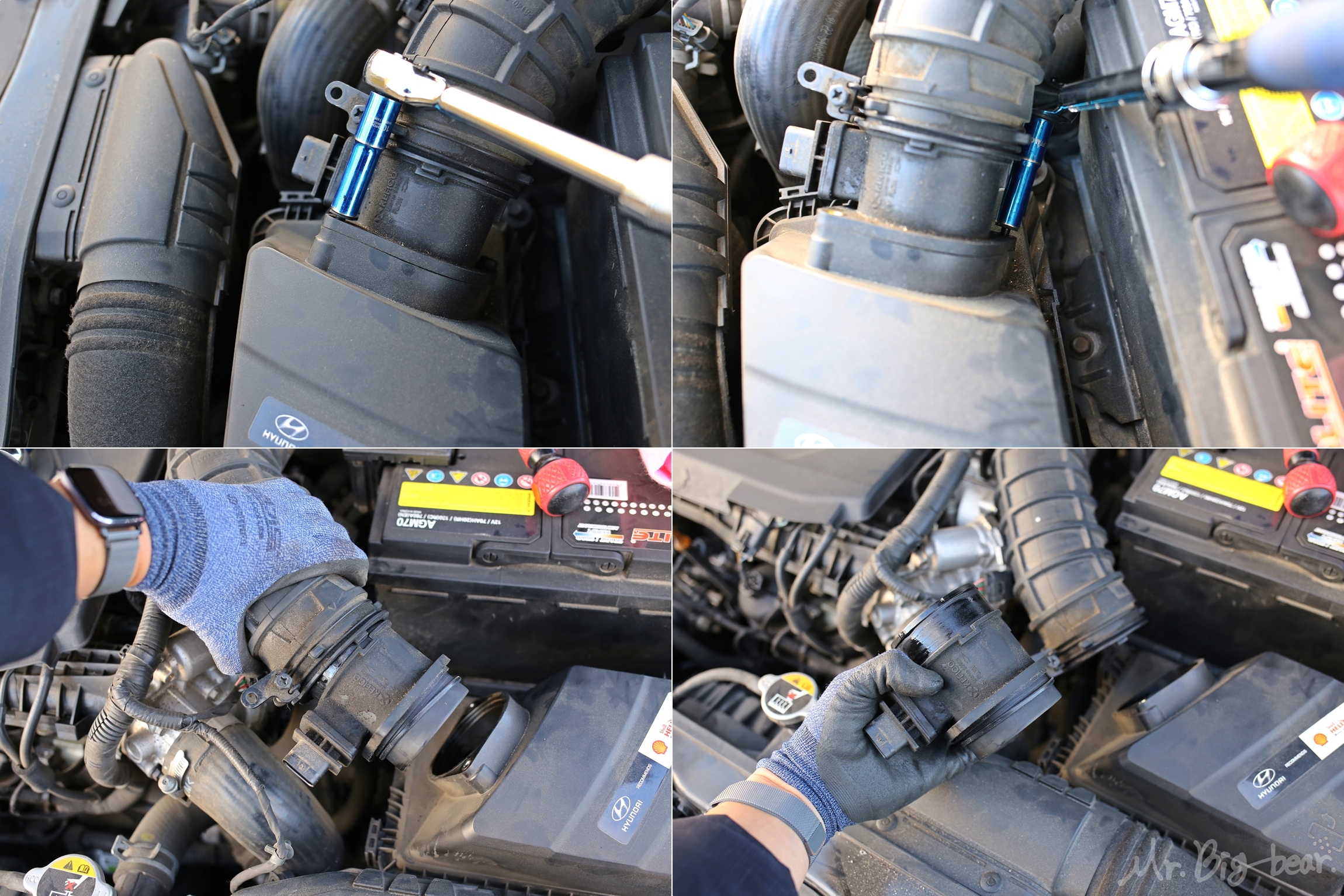 세척제는 순식간에 증발되므로 기다릴 필요없이 바로 장착해줍니다. 센서 한쪽에 있는 오링(O-ring)이 분실되지 않게 조심하고, 인테이크 호스 쪽 클램프부터 조여줍니다. 클램프는 빠지지 않을 정도로만 적당히 조여주고, 볼트는 엔진룸에 떨어뜨리지 않도록 꼭! 주의합니다. 마지막으로 와이어링 고정 클립과 커넥터도 '딱' 소리 나게끔 결선해주면 작업 끝!