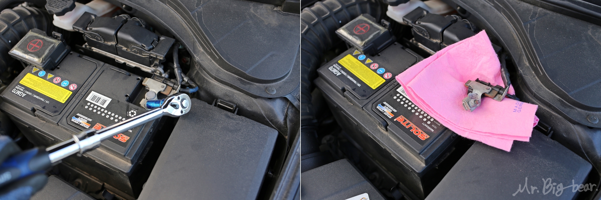 센서에 연결된 커넥터를 탈거해야 하니, 10mm 소켓과 라쳇으로 배터리 (-)단자를 먼저 탈거해줍니다. 탈거한 단자는 전류가 흐르지 않도록 헝겊이나 플라스틱 같은 부도체 위에 올려줍니다.