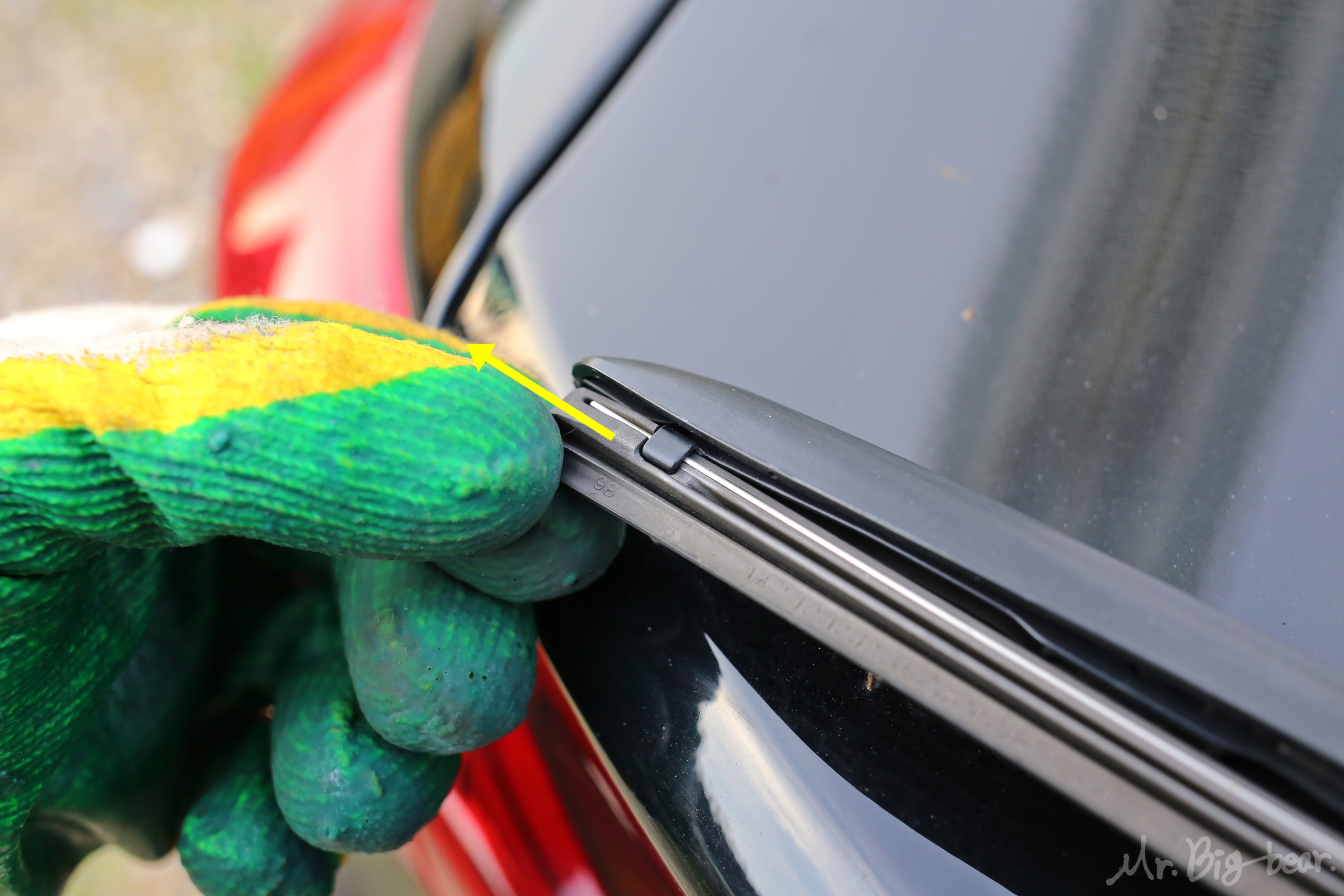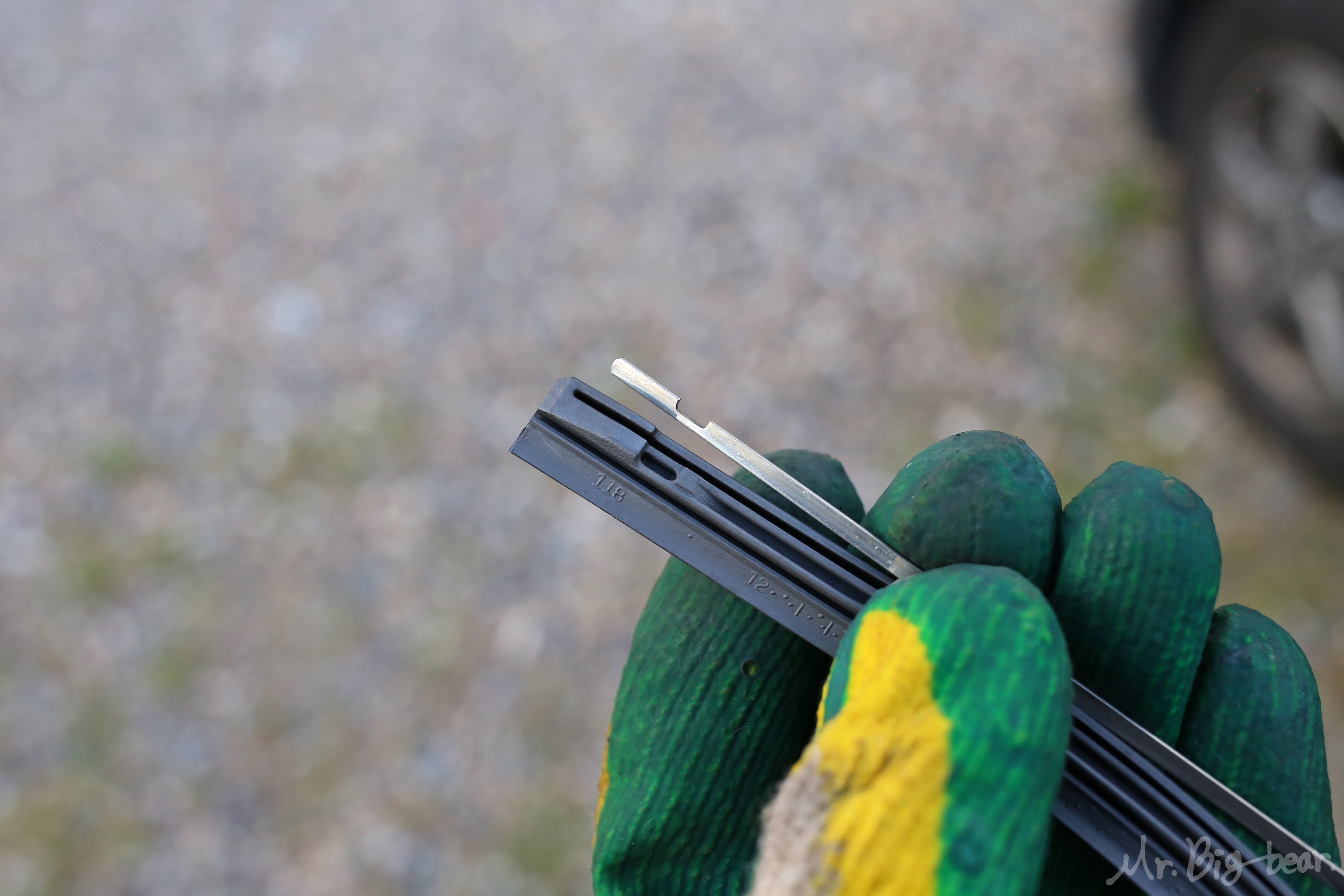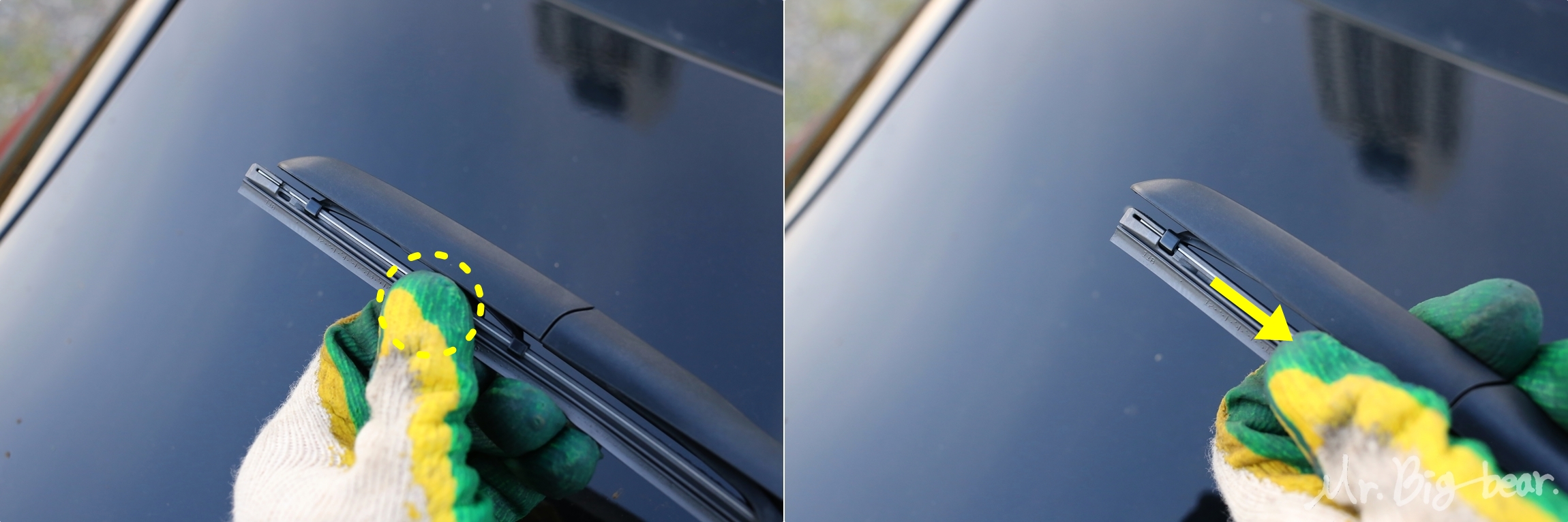 와이퍼 앗세이에서 리필 고무만 분리해주기 위해 와이퍼 먼저 탈거해줍니다. 차량에 장착된 상태에서는 하기 힘든 작업이므로 탈거해서 트렁크에 올려놓고 해도 되고, 집에 가져가서 해도 됩니다.