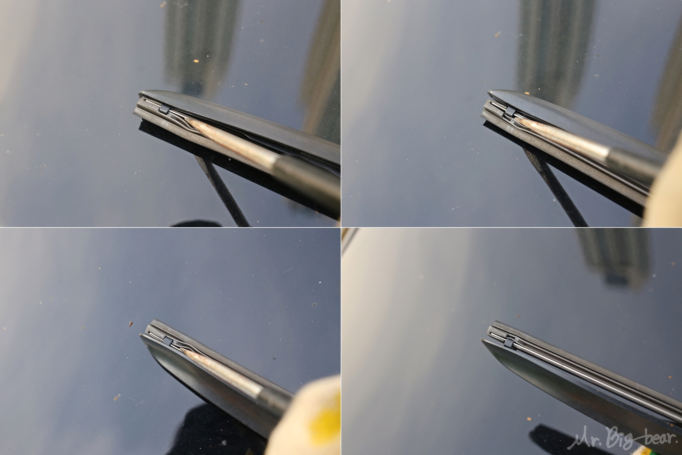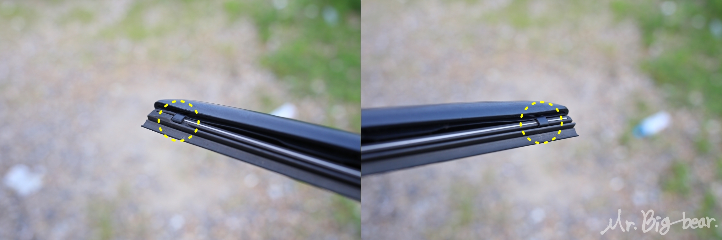 얇은 금속 구조물을 새 리필 고무에 넣고 블레이드 와이퍼 앗세이에 다시 조립해줍니다. 한가지 주의할점은 리필 고무를 삽입할때 홈이 파여져 있지 않은 부분부터 삽입해줘야 합니다. 그러면 우측 사진처럼 완전히 조립되지 않고 홈 파여진 부분이 걸리게 됩니다.