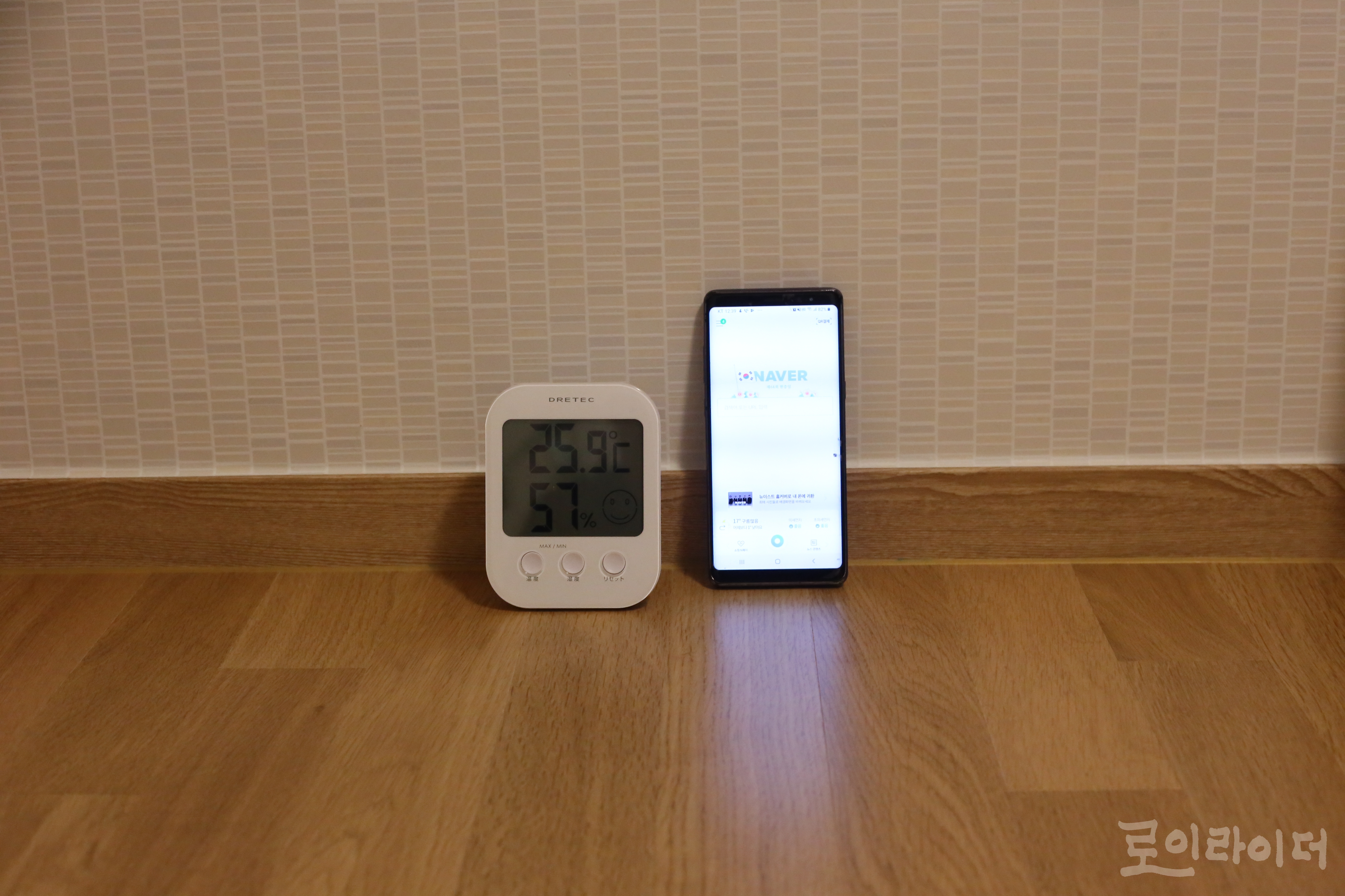 숫자가 멀리서도 얼마나 크게 잘 보이는지 갤럭시 노트8과 비교해보았습니다. 'NAVER' 글자의 약 2배 크기가 숫자 크기 정도 되겠네요. 온습도계 구매시 가장 중요한 부분인 것 같습니다.