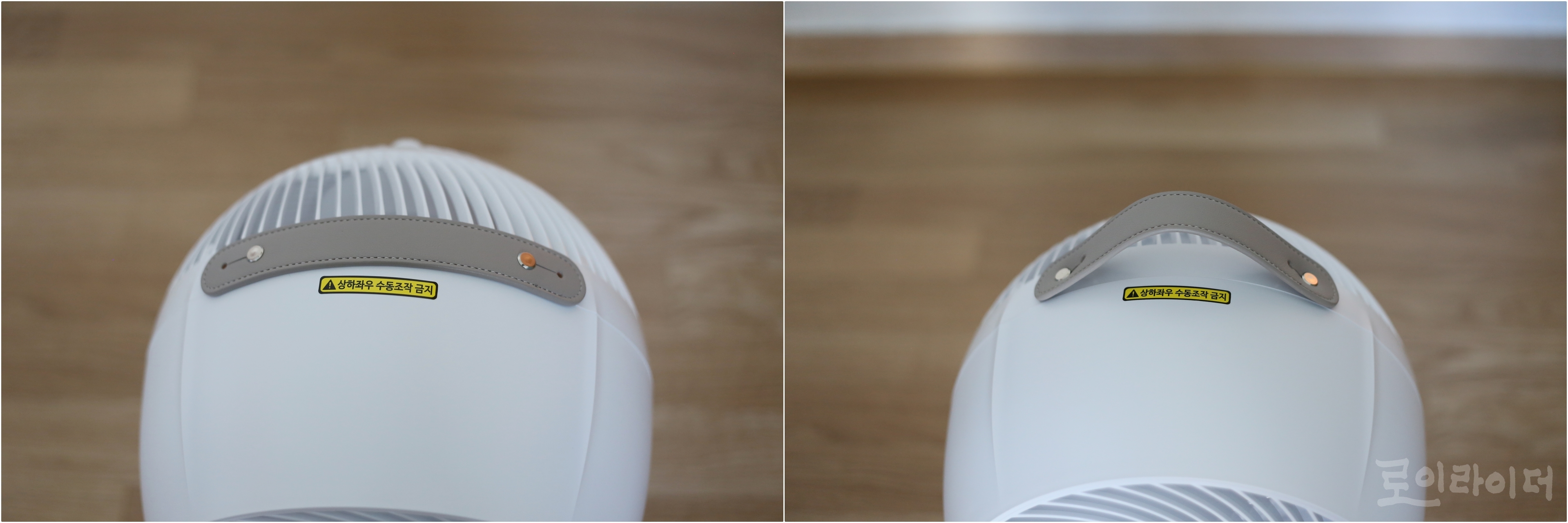 제품 상단에는 이동시 들기 편하도록 가죽으로 손잡이를 만들어 놓았습니다. 디자인이 너무 둥글둥글해서 막상 저 손잡이가 없으면 한손으로 들 수가 없습니다. 쓸모있는 손잡이를 추가한 것도 매우 탁월합니다.
