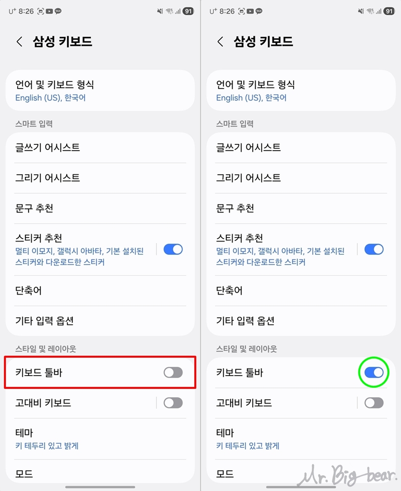 그럼 아주 반갑게도 '스타일 및 레이아웃' 항목에 "키보드 툴바" 라는 항목이 보입니다. 좌측 사진처럼 아마 비활성화 되어있을텐데, 활성화 해주시면 끝입니다.
