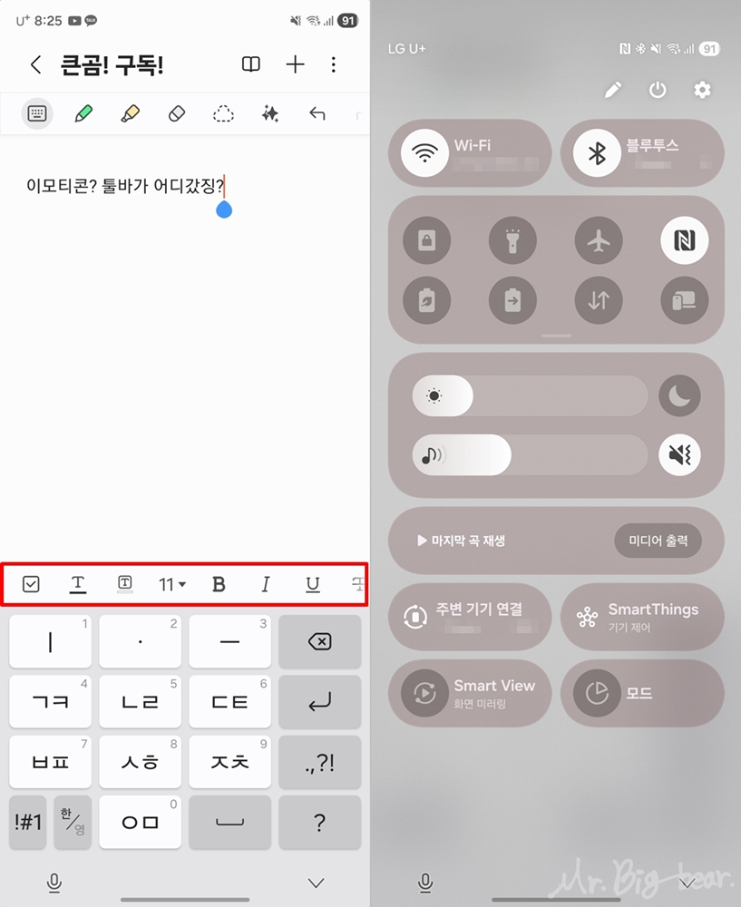 갤럭시 스마트폰을 사용하다보면, 갑자기 사용하려는 이모티콘 아이콘(?) 이 없어질 때가 있습니다. 정확히는 '키보드 툴바' 가 사라진건데, 왜 사라지는지 모르겠지만 손쉽게 다시 보이게 할 수 있습니다.