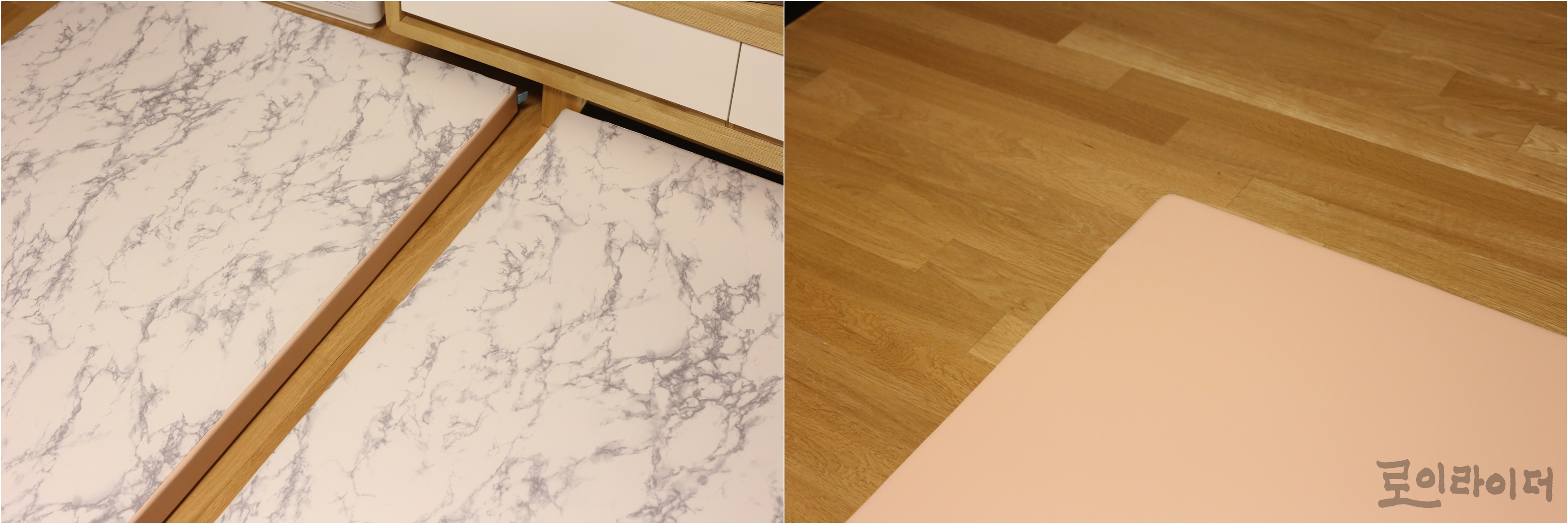 현재 거실 상황입니다. 매트 2개를 붙여놓았는데, 벽쪽에 부딪히는 매트는 밀릴 일이 없지만, 바깥쪽에 있는 매트는 발가락으로 톡 쳐도 시원하게 미끄러지면서 매트 사이가 벌어집니다. 마치 카트라이더 바나나 껍질처럼 애기들뿐만 아니라 성인이 급하게 걸어가다가 밟아도 다칠까 우려되는 수준입니다. 매트 뒷면이 아무런 표면처리 없이 매끈하고, 바닥면도 장판이라 생기는 어쩔 수 없는 상황입니다.