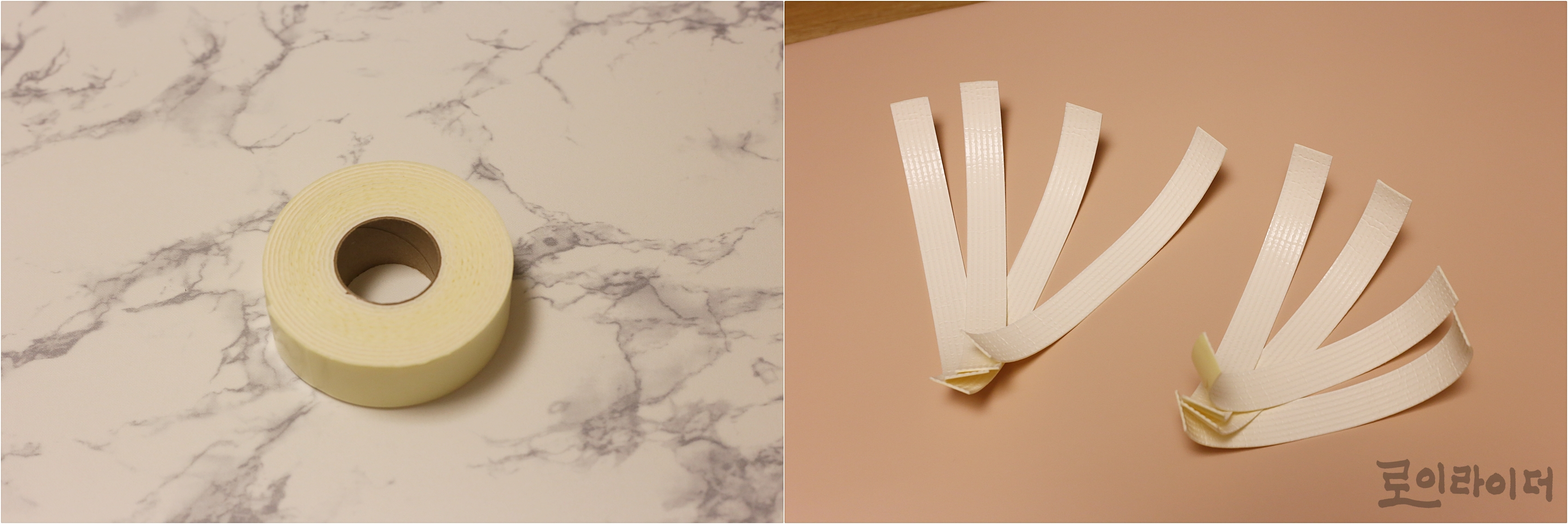 포장을 뜯으면 돌돌 말린 테이프처럼 생긴 제품이 들어있습니다. 테이프 폭은 3cm, 4cm 두가지 타입이 있는데, 3cm를 구매해보니 굳이 4cm 를 살 필요가 있나 싶을 정도로 밀림 방지 효과는 차고 넘칩니다. 매트 모서리에 'ㄱ' 자로 2개씩 붙이기 위해 비슷한 크기로 잘라서 꼼꼼하게 부착했습니다. 참고로 테이프(패드)가 너무 두껍거나 딱딱하지 않아서 일반 가위로도 쉽게 자를 수 있습니다.