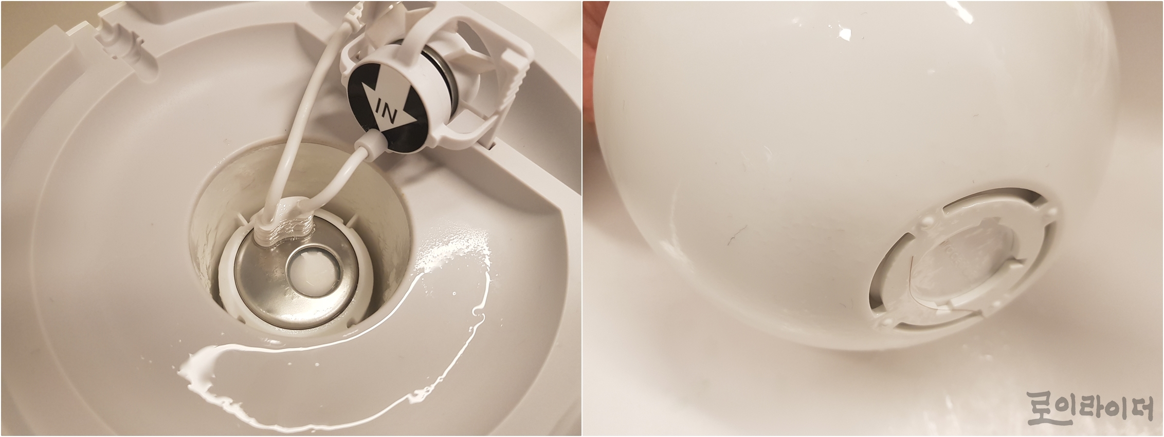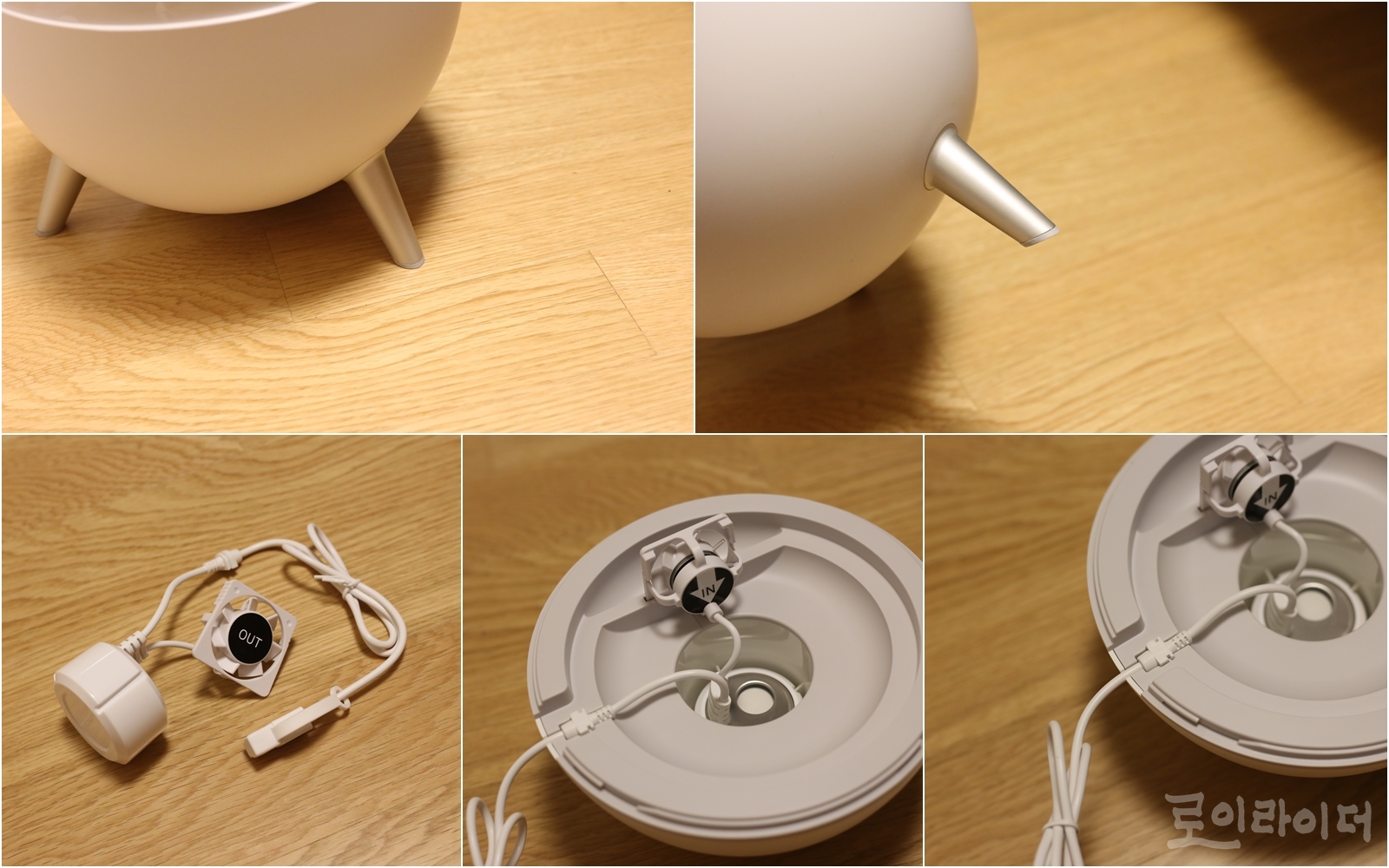 수조 밑에는 나름 세련된 다리 3개가 있는데, 끝에 미끄럼방지 고무 패드가 퍽 맘에 들더군요. 쉽게 빠지지 않고, 미끄러지지 않도록 끈끈하게 잘 버텨줍니다. 가습 '엔진' 이라고 부르기에 민망할 정도로 아기자기한 가습엔진은 조립해보면 빡빡하지도, 느슨하지도 않게 홈에 딱 맞춰 조립되서 신경써서 만든 제품이라고 느껴집니다. 여러 제품을 구입해서 조립해보면 잘 맞지 않아서 빡빡하고 힘든 경우가 있는데, 이런 부분에서 만듦새가 좋은편인 것 같습니다.