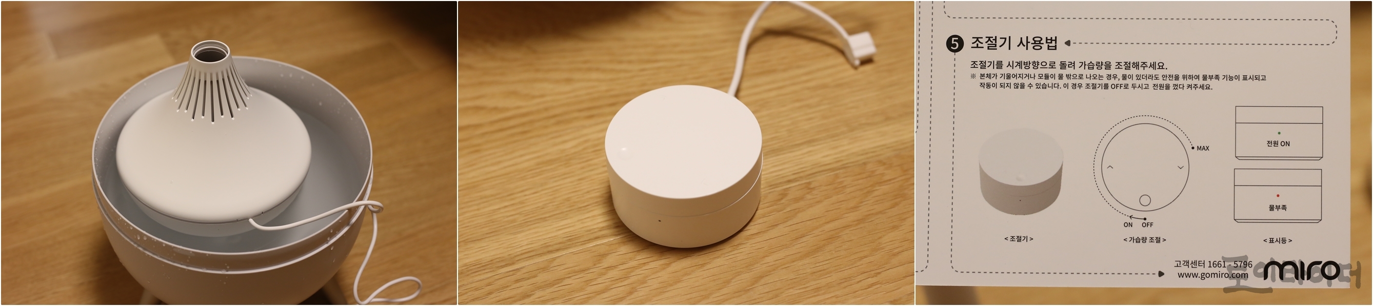 가습엔진 조립을 끝내고 수조에 물을 채우면 본체가 동동 떠다닙니다. 가습되는 모터(엔진)이 물 속에 잠겨있는 경우는 봤어도, 이렇게 종이배마냥 동동 떠다니는게 신선하네요. 조절기는 생각지도 못했는데, 돌리면 딸깍하고 켜지면서 분무량이 조절되는게 엄청 부드럽고 사용하기 편합니다. 가습기를 사용하면서 가장 손으로 많이 만지는 부분인데 부드럽고 직관적인게 아주 마음에 듭니다.