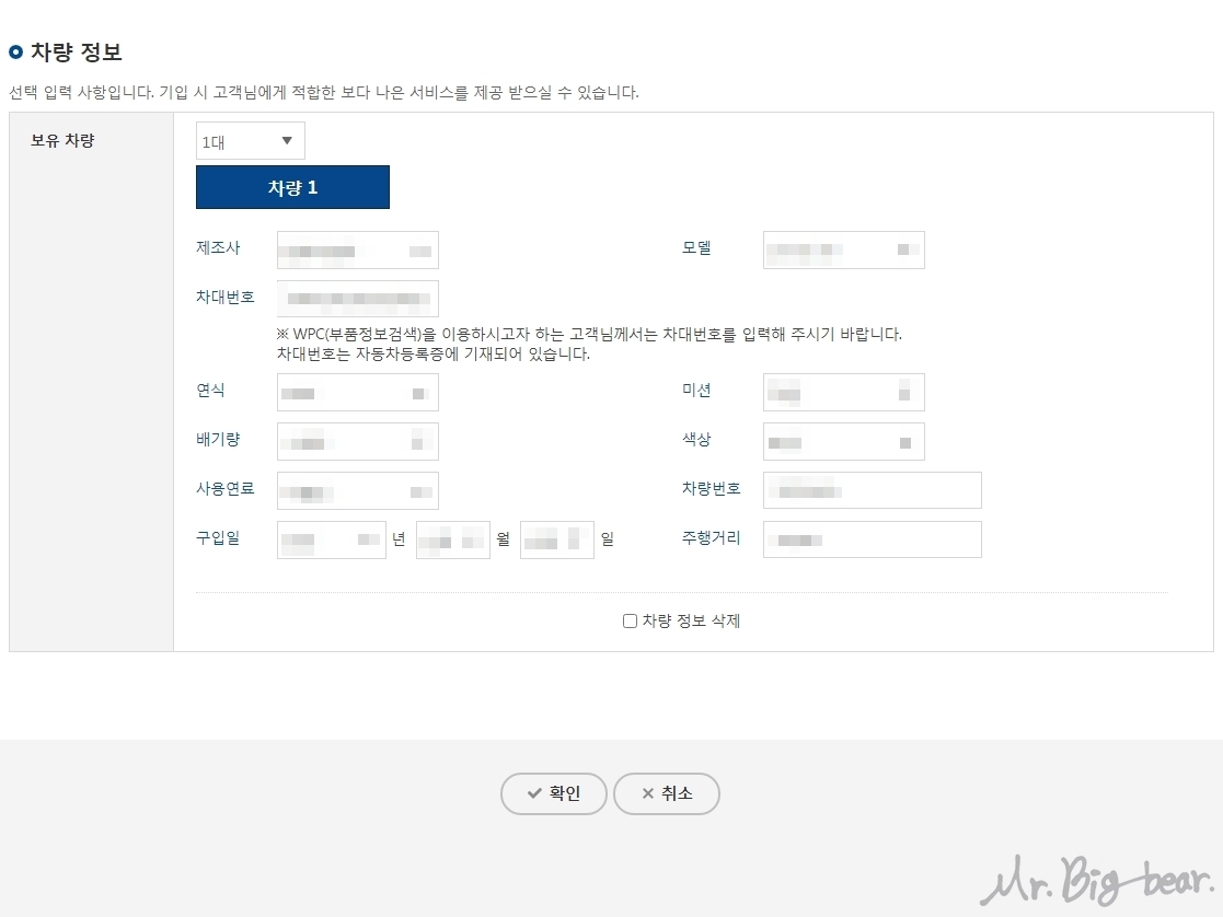 한가지 단점이 있다면, 상세하게 검색하기 위해서는 회원가입후 내 차량의 '차대번호' 를 입력해야 한다는 점입니다. 아래에서 다룰테지만, 차대번호 없이 단순하게 차종(예. 그랜저 17) 으로도 검색이 가능하지만 정확도가 떨어지고 부품의 위치나 형상을 확인할 수 없습니다. 현대/기아자동차를 소유하고 있다면 현대모비스 홈페이지 회원가입후 차대번호를 입력하시는 걸 추천하고, 차량은 여러대 등록할 수 있습니다.