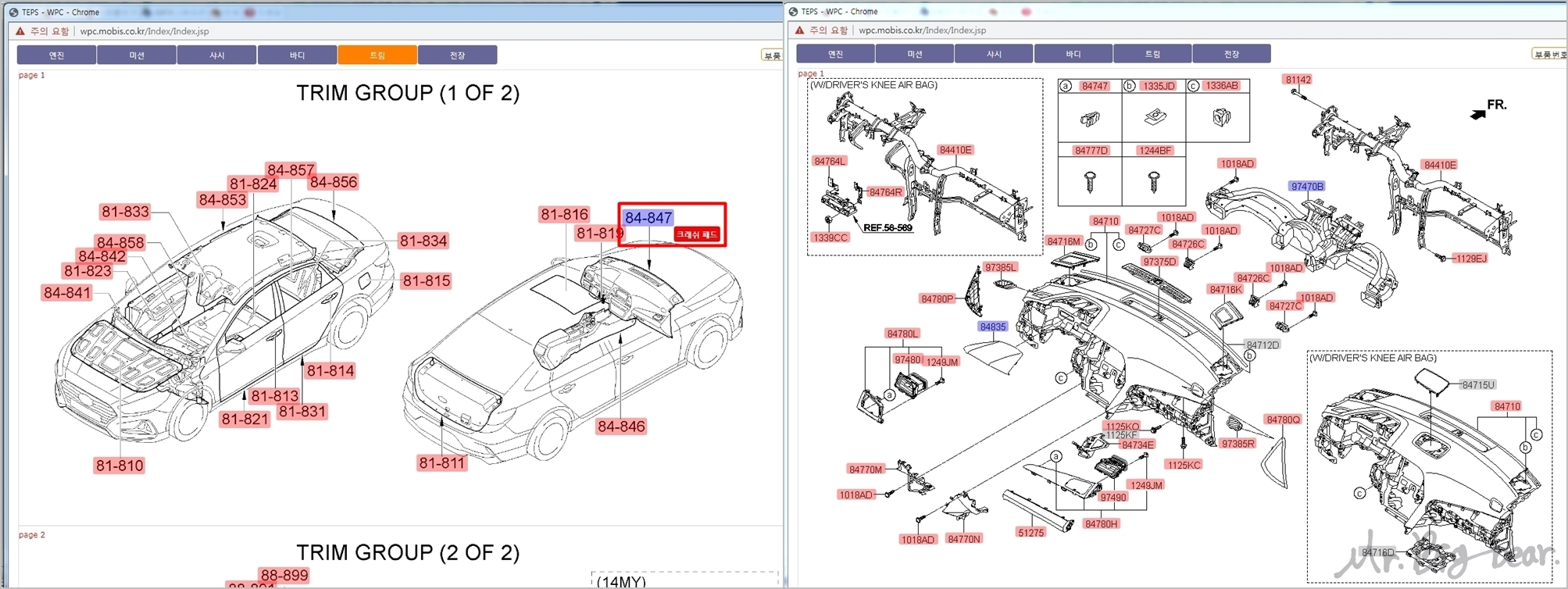 와.우. WPC에 처음 접속하고 입에서 나온 말입니다. 도면까지는 아니지만.. 이정도면 차량의 전반적인 레이아웃이나 구성을 확인하기에는 차고 넘칠 정도로 상세하게 나와있습니다. 엔진, 미션, 샤시, 바디, 트림, 전장으로 대분류되고 예로 '84-847(크래쉬 패드)' 를 선택하면, 크래쉬 패드에 달려있는 모든! 트림류들과 프레임까지 보여줍니다. '제조사 입장에서 이렇게까지 상세한 구성을 다 오픈하는게 괜찮은가?' 라는 쓸데없는 걱정(?)도 되면서, 자가정비를 즐기는 차주 입장에서는 그저 고맙기만 합니다.