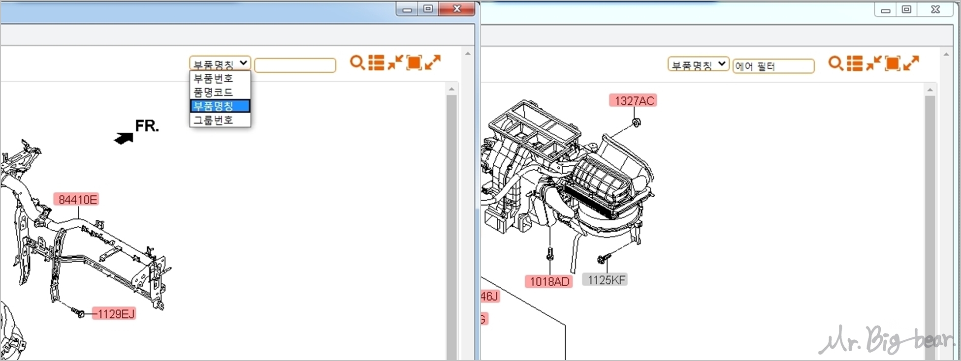 WPC 페이지에서 대분류로 일일이 찾는법 외에 부품번호, 품명코드, 부품명칭, 그룹번호로 직접 검색하는 기능도 있습니다. 예를 들면, 에어컨필터를 교환할 때가 되었는데 부품명칭에서 '에어 필터' 라고 검색하면 어떻게 나오는지 보여드리겠습니다.