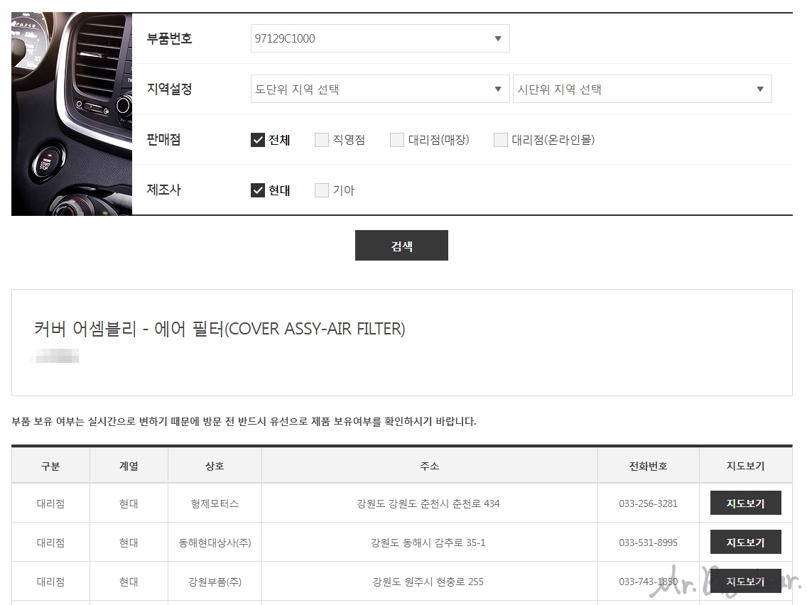 부품목록에서 더블클릭하면, 지역별로 구매 가능한 판매점까지 조회할 수 있습니다. 물론 오프라인 판매점까지 가지않고 초록창에서 구매가 가능하지만, 부품 조회부터 구매 가능한 판매점까지 확인이 가능하다는 점은 제조사에서 제공하는 큰 서비스임에 틀림 없습니다. 어찌보면 차량을 구매할때, 이러한 서비스 제공 비용도 포함되어 있다고 볼 수 있습니다. 근래 우리나라도 미국의 가라지(garage) 문화처럼 자가정비에 대한 관심이 커지고 있는데, 관심이 커지는 만큼 국내 자동차/튜닝 산업에도 긍정적인 영향을 끼칠 것이라 생각합니다. 저 뿐만 아니라 많은 분들이 WPC 서비스를 활용해서 차량에 대한 관심과 좋은 문화를 만들어갈 수 있었으면 좋겠습니다.
