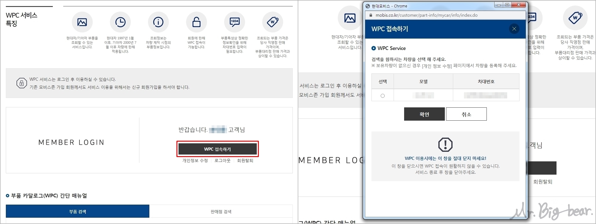 로그인 후 '부품 상세 검색(WPC)' 페이지에 접속하면, 'WPC 접속하기' 라는 버튼이 보입니다. 버튼을 누르고 내 아이디에 등록된 차량 중 검색할 모델을 선택하시면 WPC에 접속할 수 있습니다. 여기에 G80, GV80, 벨로스터N.. 등 다수(?)의 차량이 있었으면 하지만, 스쳐지나가는 월급통장을 보고 착하게 살기로 마음을 다잡습니다.