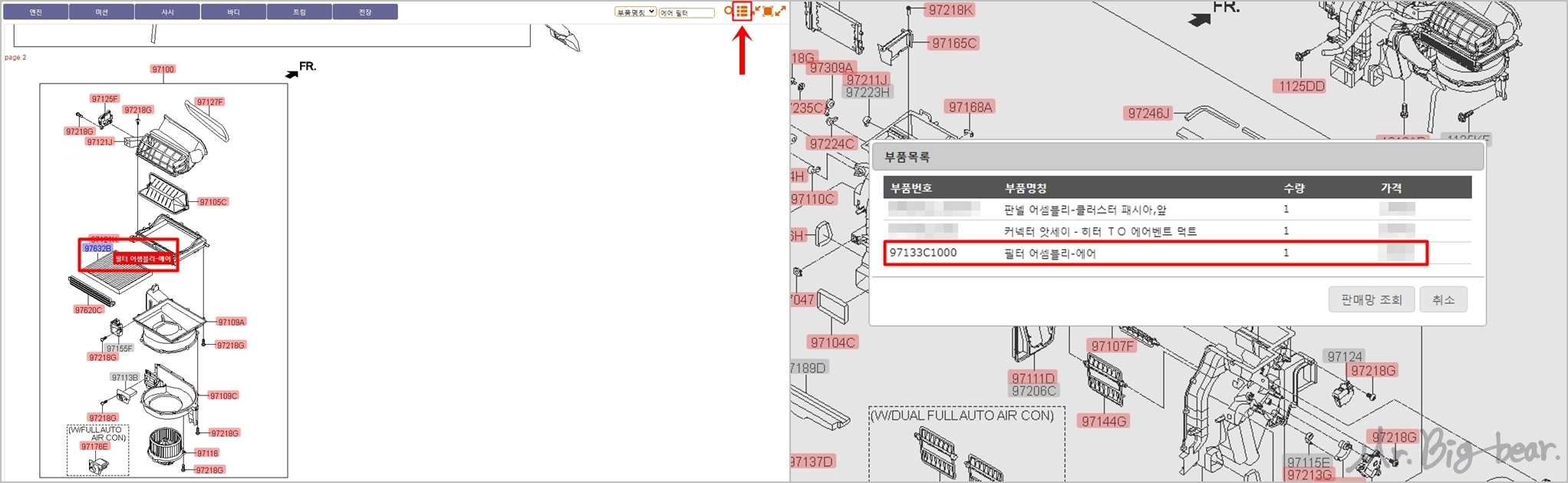 에어 필터라고 검색하니 '97632B(필터 어셈블리-에어)' 라고 공조장치용 부품 페이지가 나타났습니다. 참고로 97632B 가 부품번호는 아닙니다. 97632B 아이콘을 한번 선택해주고, 페이지 우측 상단의 목록처럼 생긴 아이콘을 누르면 '부품목록' 이라는 창이 새로 뜹니다. 여기에 내가 검색했던 부품들이 누적해서 보여지는 것 같습니다. LF 쏘나타용 에어컨 필터는 부품번호가 '97133C1000' , 부품명칭은 '필터 어셈플리-에어' , 가격은.. 공개해도 되는지 몰라서 모자이크 처리했습니다.