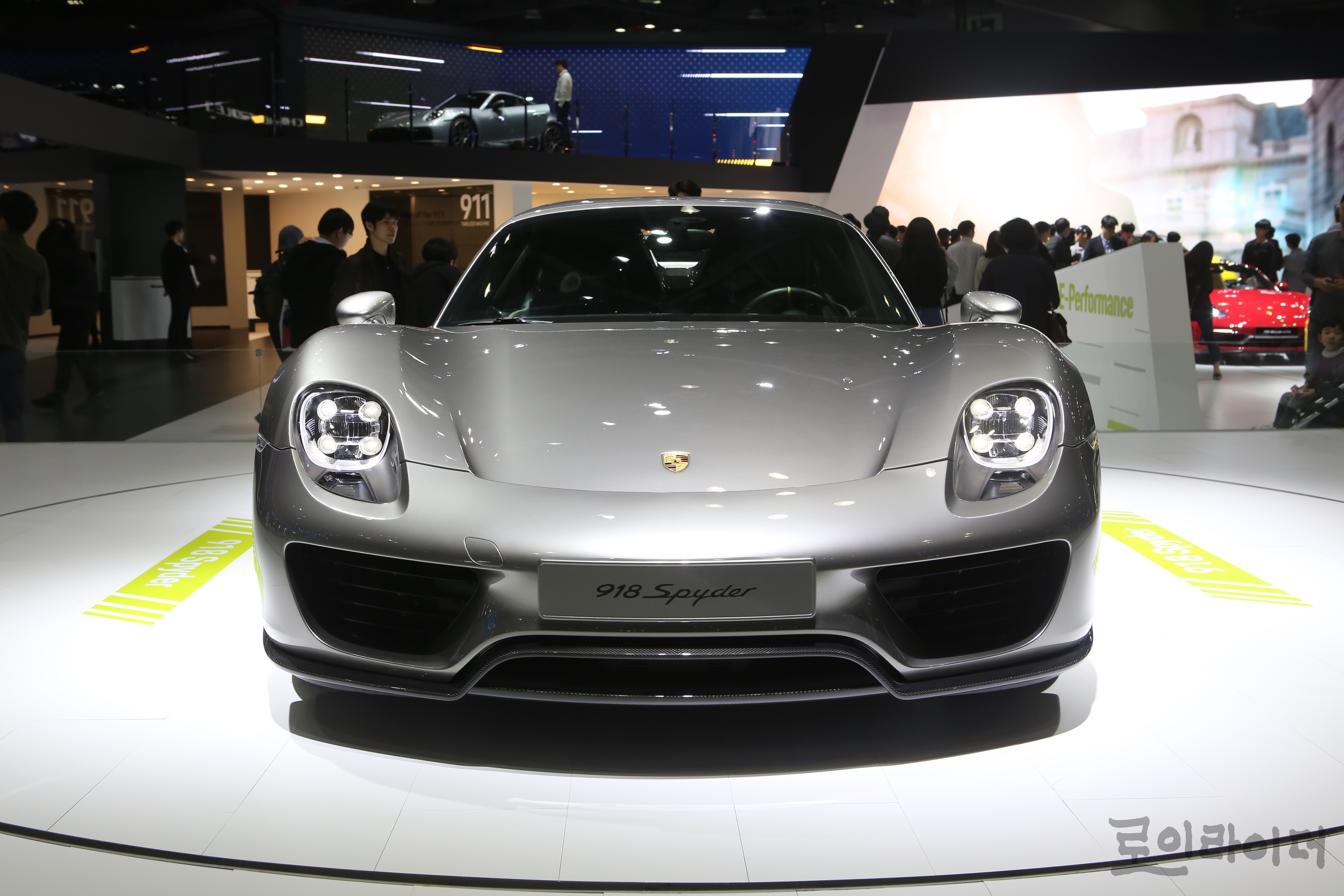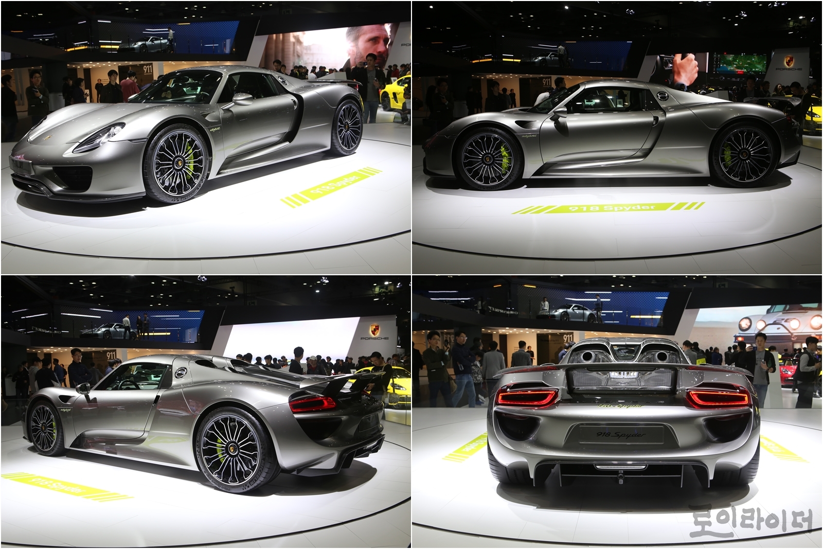 이름만 들어도 어마무시한 PORSCHE "918 Spyder" 입니다. 포르쉐 부스 정중앙에 숨막히는 포스를 내뿜으면서 시계방향으로 빙글뱅글 돌아가고 있었습니다. 포르쉐의 온갖 기술력을 몽땅 때려박은(?) 모델인데, 성능 좋다는 당연한 얘기는 재미없습니다. 918이 다른 슈퍼카들과 가장 큰 차이점은 '하이브리드' 차량이라는 점입니다. V8 가솔린 엔진, 두 기의 모터가 달렸는데, 감히 연비가 30.3km/l 랍니다. '성능과 연비는 반비례 관계가 아니었나?' 하는 생각에 뒤통수를 후려치는 아주 파렴치한(?) 모델입니다. 외계인을 고문해서 만들었다는게 맞는 것 같습니다.