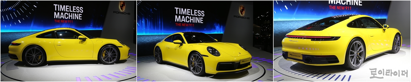안쪽에는 노란 개구리 한마리가 역시 시계방향으로 빙글뱅글 돌고 있었습니다, "THE NEW 911". 아직까지 RR(Rear Engine - Rear Drive) 구동 방식을 가진 모델로, 뒷바퀴 축 뒤(흔히 말하는 트렁크 공간)에 엔진이 달려있습니다. 대부분의 차량들이 앞바퀴 축 중심으로 엔진이 배치되서 무게중심이 앞에 쏠려있는 것과 정 반대되는 설계지요. 운전대는 꿈도 안꾸고, 그냥 조수석에라도 타봐서 도대체 RR이 뭔지! 알알이 뭔지! 살짝 느껴보기라도 하고 싶습니다. (911 타시는 분들 연락 기다릴게요)