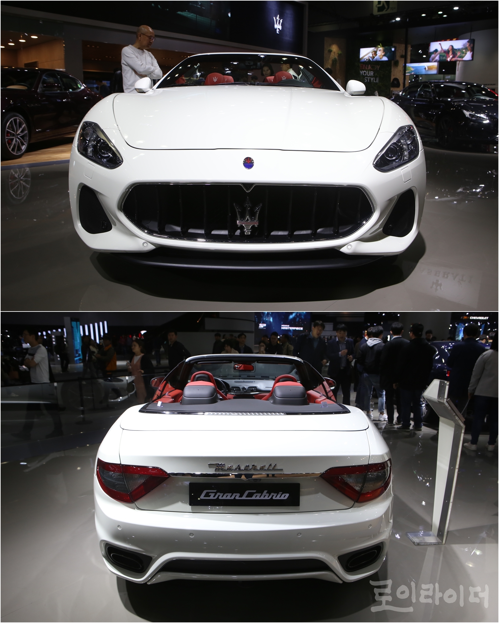 다음으로 마세라티 "Gran Cabrio(그란 카브리오)" 모델입니다. 우악스럽게 벌린 입이 웃는것 같으면서도 잔뜩 인상쓴것이 미치도록 멋집니다. 그에 반해 솔직히 뒷모습은 다소 심심한 편이네요. 앞모습은 아무리봐도 쫙 벌린 입이 제 취향저격입니다.
