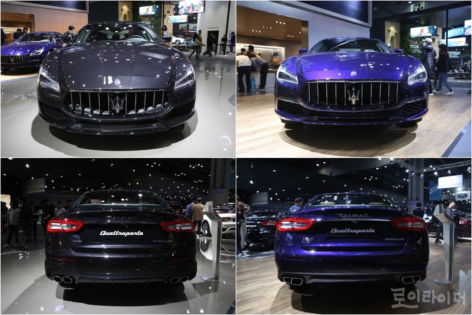 세상의 수많은 차량중에 제가 가장 좋아하는 브랜드 중 하나가 바로 "MASERATI(마쒜라튀)" 입니다. 마세라티 부스는 명품 매장처럼 줄서서 정해진 인원만 차례로 들어갈 수 있었습니다. 사진속 모델이 바로 마세라티 "Quattroporte(콰트로포르테)" 인데 왼쪽이 SQ4, 오른쪽이 GTS 모델입니다. SQ4 모델은 3.0리터 V6 트윈터보 엔진을, GTS 모델은 3.8리터 V8 트윈터보 엔진을 장착하고 있습니다. 외관만 보면 차이를 알기 쉽지 않은데, 엠블럼을 제외한 리어범퍼 하단의 머플러팁 형상을 보시면 차이를 알 수 있습니다.