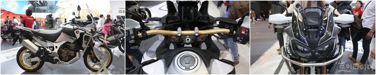 기술의 혼다. 혼다 부스에 자동차도 몇대 있었는데, 별로 관심이 없어서 사진은 안찍었습니다. 대신 도로에서 더 보기 힘든 '아프리카 트윈' 바이크에 한번 앉아보고 왔네요. R1250GS와 마찬가지로 뒷꿈치는 닿지 않습니다. 둘다 어마무시하게 큰건 마찬가지고, 개인적으로 디자인은 BMW의 승. 하지만 아프리카 트윈 모델에는 한번 다시 돌아보게 하는 궁극기가 들어있는데, 바로 'DCT' 입니다. 멀티퍼포스 모델에 DCT가 왜 필요한지 이해하지 못할수도 있지만, 이러한 리터급 모델들은 장거리 투어에도 사용되기 때문에 연료 효율, 성능, 편의성 면에서 무시할 수 없습니다. 더불어 아프리카 트윈에 장착된 DCT는 경사각도 판단해서 적절한 단수로 킥다운을 해준다고 하니, 두말할 필요 없겠네요. 기회가 되면 DCT 달린 바이크 꼭 한번 타보고 싶습니다. 기다릴게요 여러분.