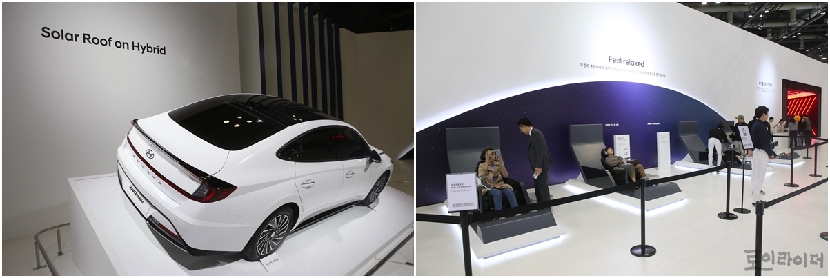 아직 정식 출시하지 않은 SONATA Hybrid 모델도 있었는데, 'Solar Roof'(쏠라루프) 옵션이 장착된 차량 1대가 전시되어 있었습니다. 요즘은 아파트에서도 태양광 패널로 전력 생산하는 것을 볼 수 있는데, 이제 자동차에도 이런 기술이 적용되기 시작하네요. 설명에 따르면 일 5시간 이상 일조량이 유지될시 1년에 1,300km 더 주행할 수 있다고 하는데 지하주차장, 건물주차장 문화가 자리잡은 국내에서 얼마나 효과를 보여줄지는 아직 의문입니다.
