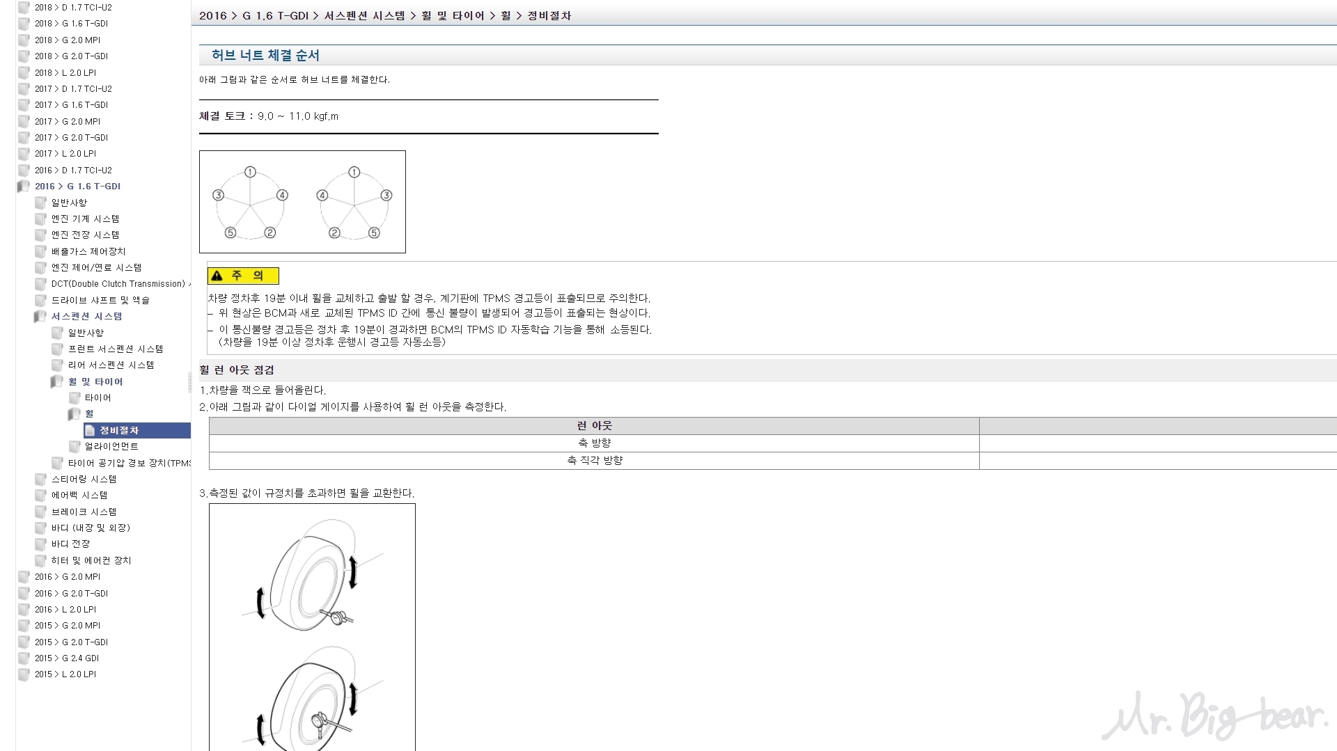 한번 더 예를 들어서 휠 타이어 탈거/장착에 대한 정비방법을 찾아봤습니다. 저도 아직 휠너트의 정확한 체결(조임) 토크를 몰랐는데, 확인해보니 9.0~11.0 kgf.m 입니다. 휠 너트를 별 모양 순서대로 체결하는 기본적인 상식부터, TPMS 경고등 점등에 대한 사소하지만 중요한 꿀팁까지 정말 많은 정보를 포함하고 있습니다. 마침 차량 하부 정비에 대한 컨텐츠를 작성중인데, 헷갈리는 부분이 있으면 종종 접속해서 공부하고 있습니다.
