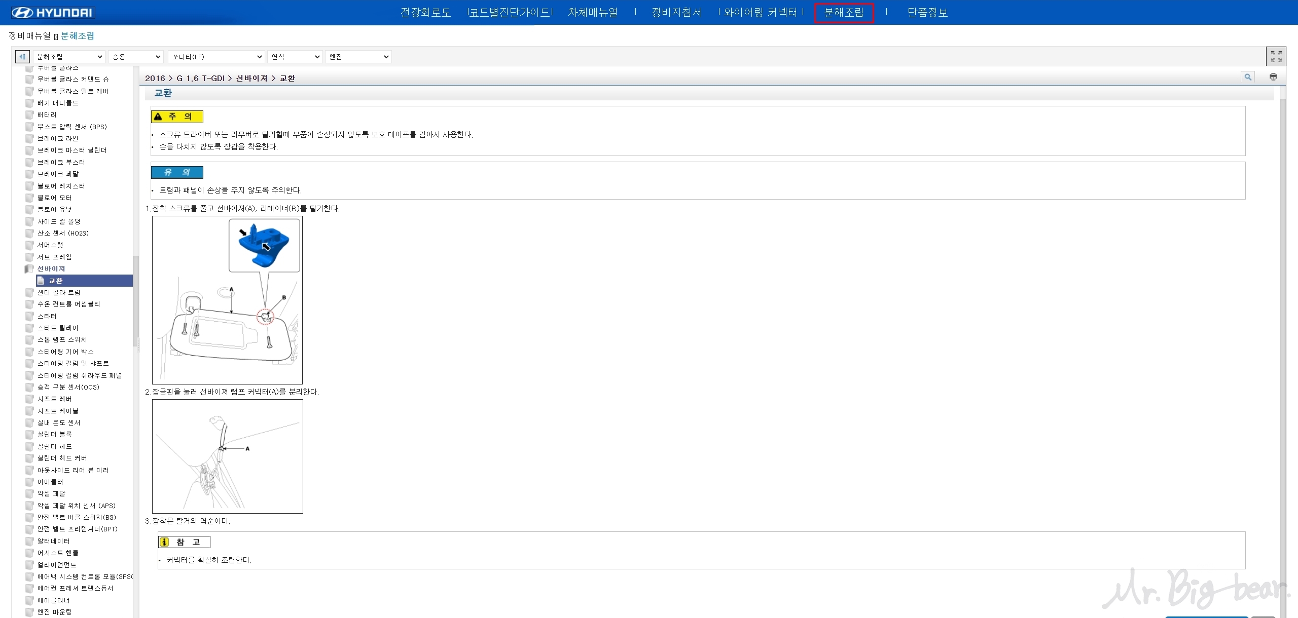 마지막으로 실내 부품에 대한 경정비도 모두 확인이 가능한데, 정비지침서보다 '분해조립' 메뉴에서 더 다양한 정보 확인이 가능합니다. '분해조립' 에는 부품명이 가나다 순으로 나열되어 앞좌석 상단에 있는 '선바이져' 를 비롯 사소한 트림류들의 교체방법도 모두 확인이 가능합니다. 물론, 트림류들의 탈거/장착 방법에 대해서는 디테일이 모자랄 수 있으나, 부족한 부분은 블로그나 유튜브를 통해 확인이 가능하므로 GSW는 교과서처럼 기본적인 내용을 확인하고 객관적인 값을 참조하는데 활용하는게 더 좋을 것 같습니다.