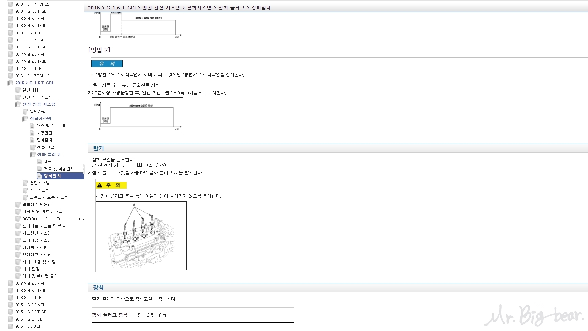 예시로 제가 최근에 DIY로 작업했던 '점화플러그' 에 대한 내용을 찾아봤습니다. '엔진 전장 시스템 - 점화시스템 - 점화 플러그' 로 들어오면 제원, 개요 및 작동원리, 정비절차를 확인할 수 있습니다. 점화플러그 진단 방법부터 탈거, 장착하는 방법, 매뉴얼상 권장하는 조임 토크까지 모두 확인이 가능합니다. 이런 고급(?) 정보를 알려드리면 제 밑천이 다 드러나는 것 같아 불안하지만 혼자 알기 아까운 이 공간을 꼭 알려드리고 싶었습니다.