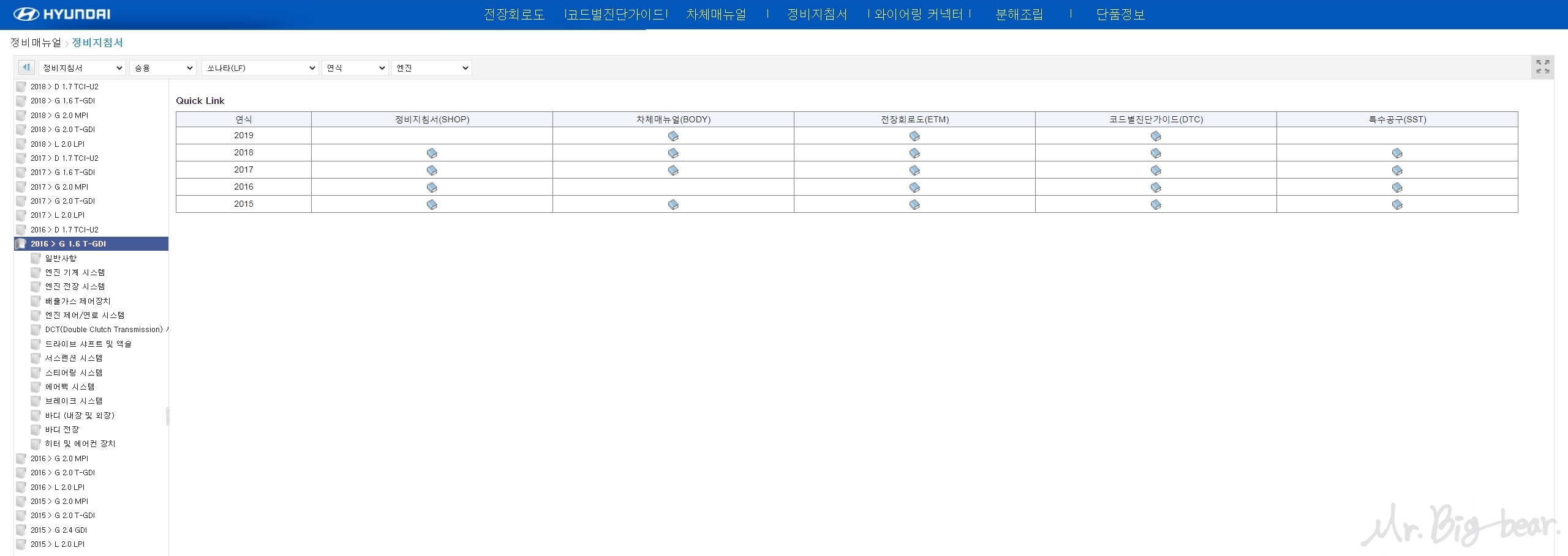 초록창에 '현대 gsw' 라고 검색하시면 "Global Service Way - Technical Information" 라고 외국 홈페이지 같은 웹사이트가 나옵니다. '현대정비지침서' , '기아gsw' 등 다양한 연관검색어가 보이는데, 이 곳에서 정비지침서를 확인할 수 있습니다.