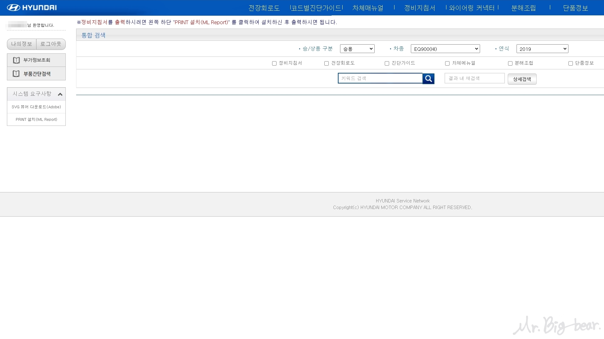 회원가입후 로그인을 하면 메인 화면이 나타납니다. 담고있는 정보들에 비해 홈페이지 디자인이나 구성은 참 소박한 편입니다. 상단부터 메뉴를 확인해보면 전장회로도, 코드별 진단가이드, 차체매뉴얼, 정비지침서, 와이어링 커넥터, 분해조립, 단품정보 등이 있습니다. 왼쪽에 있는 '부품간단검색' 을 선택하면 현대모비스(WPC) 홈페이지로 연결되서 순정 부품을 조회할 수 있습니다.