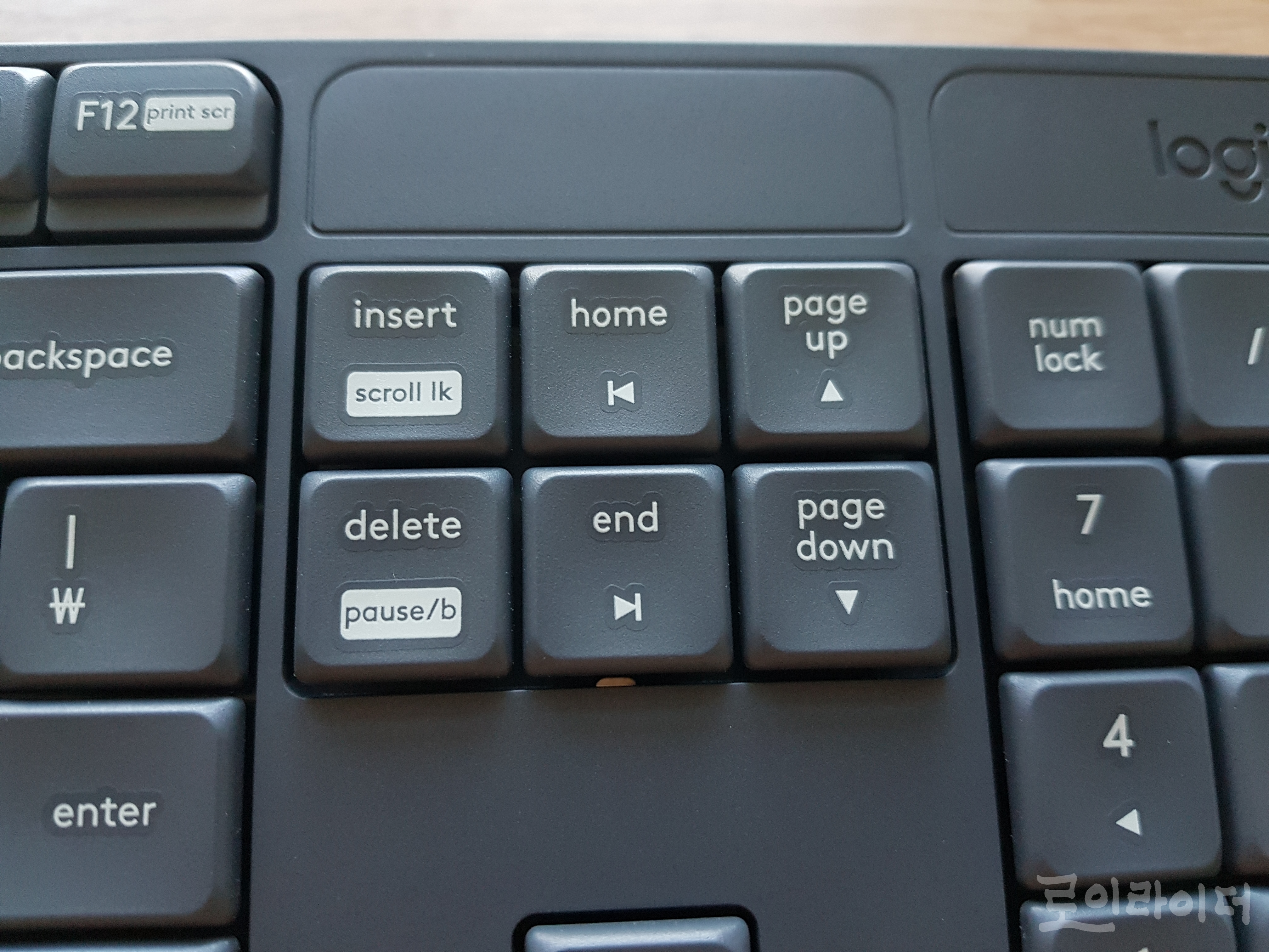 insert 키 상단을 보면 뭔가 어색합니다. 앞서 말씀드린대로 print scr 까지 펑션키로 묶으면서 키 3개를 더 없앴는데, 이 부분은 도저히 이해가 가질 않네요. scroll lk, pause/b 는 모르겠지만 화면캡쳐(print scr) 까지 없앤점은 득보단 실이 더 많을 것 같습니다.