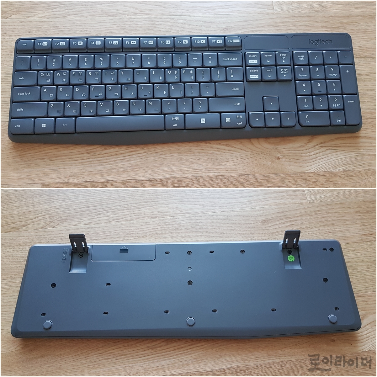 다음으로 무선 키보드입니다. 전면부를 보면 기존 로지텍 제품들과 다른점이 바로 '펑션키' 입니다. MK270을 비롯한 다른 제품들은 상단에 '기능키' 가 "별도"로 있어서 누르면 바로 작동되는데, MK235는 F1~F12 키에 '펑션키' 로 합쳐놔서 사용성이 떨어집니다. 예를들면, F4의 펑션키는 '계산기' 입니다. 업무중 바로 계산기를 사용하려면 MK270은 계산기 '기능키' 만 누르면 되지만, MK235는 오른쪽 하단의 'fn' + 'F4' 키를 동시에 눌러야 합니다. 반복적으로 사용하다보면 편의성 뿐만 아니라 타이핑 속도도 떨어집니다. 이제보니 2014년 출시의 MK270 보다 MK235 가 더 저렴한 이유가 펑션키로 통합하면서 기능키 갯수, 회로 축소로 인한 원가절감인 것 같네요. 기능키 사용빈도가 적고, 가격에 만족하시는 분들은 상관없겠지만 사용하다보니 저는 좀 불편하네요.