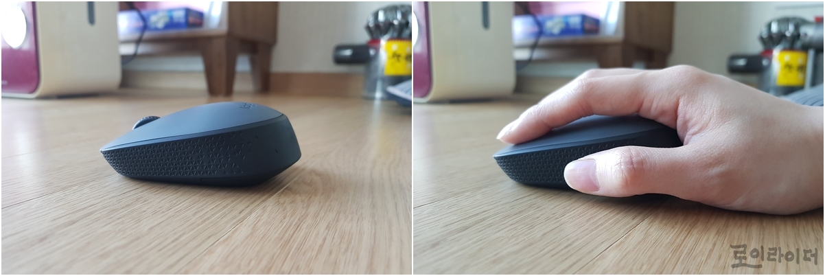 마우스 측면입니다. 사진에는 잘 안나타나지만, 손으로 잡아보면 손바닥 안쪽 공간이 많이 남아서 그립감은 이 좀 떨어집니다. 마우스가 앞/뒤 방향으로 너무 짧고 조그맣다고 해야할까요. 디자인은 예쁜데 실 사용성은 떨어지는 편입니다. 성인 남자가 사용하기에는 다소 미니미한 크기로 예민하신 분들은 불편하실 수 있으니 꼭 고려하시기 바랍니다. (사진속 고운 손은 여자사람의 손)