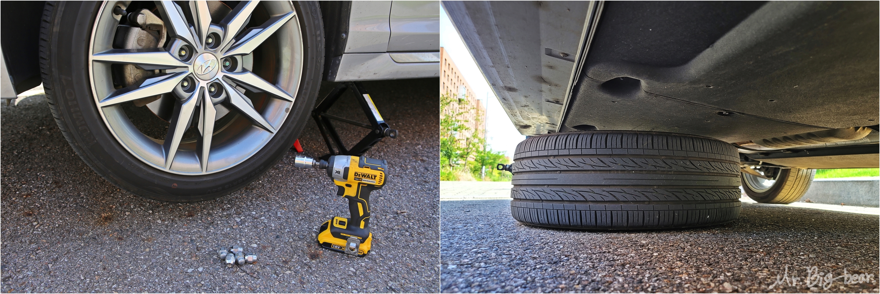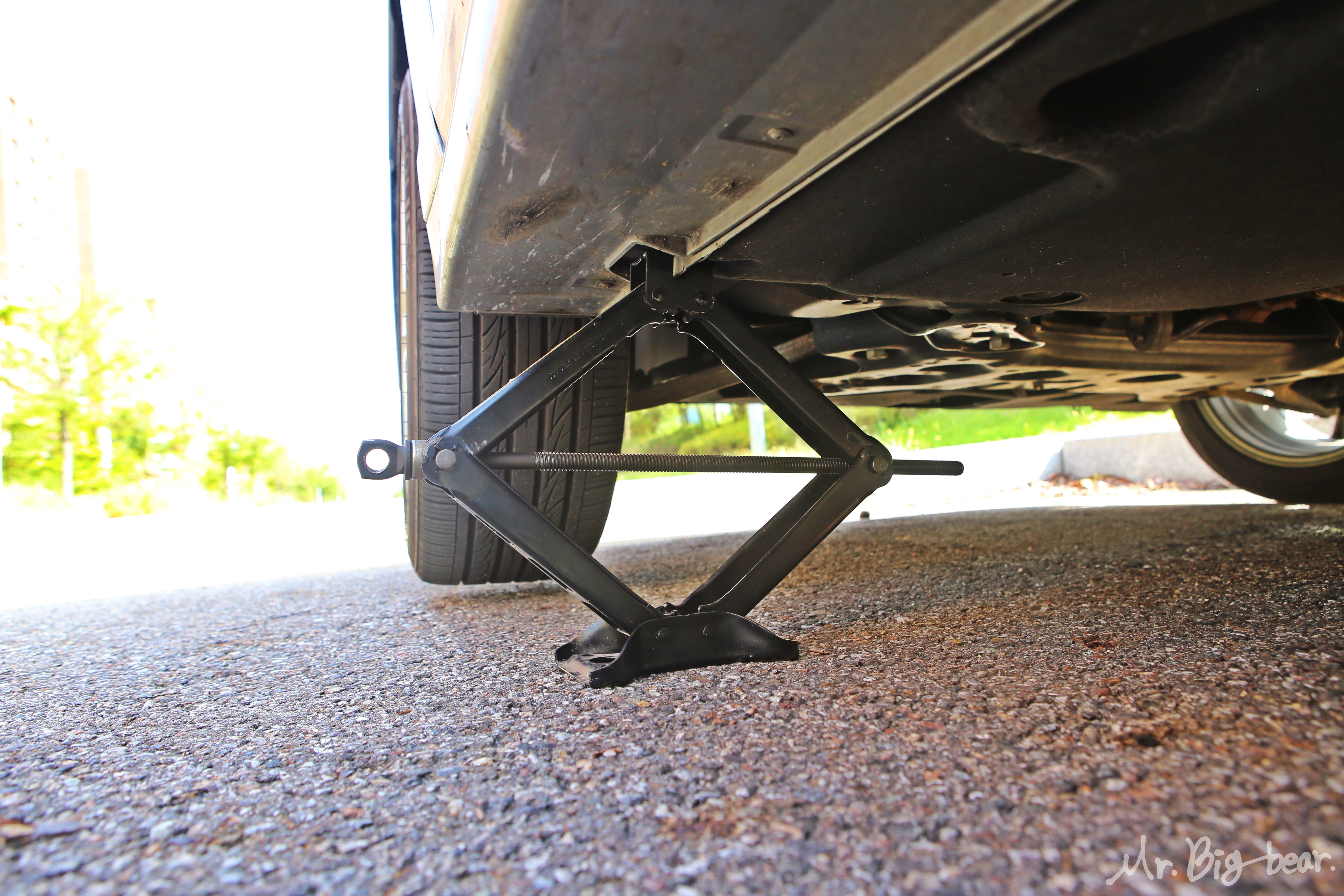 수공구로 휠너트 살짝 풀기. 바퀴를 지면에서 띄우고 휠너트를 풀려고 하면, 그 방향으로 바퀴가 같이 돌아가면서 전혀 풀리지 않습니다. 길이 조절 라쳇이나 긴 복스대를 이용해서 휠너트를 살짝만 풀어주면 차량을 들어올릴 모든 준비가 끝납니다.