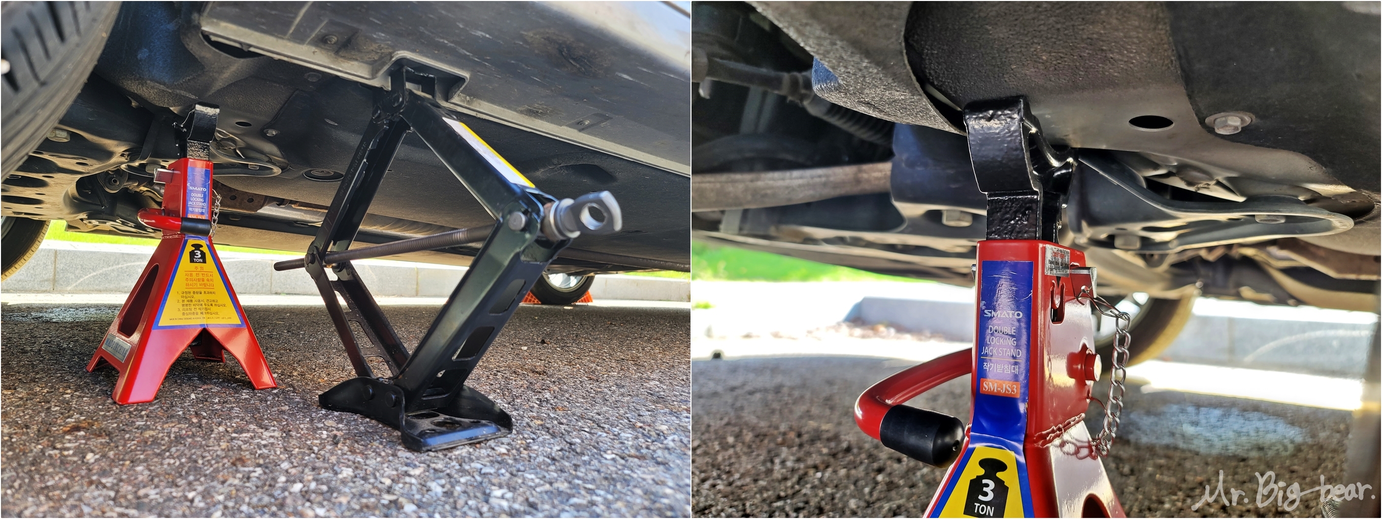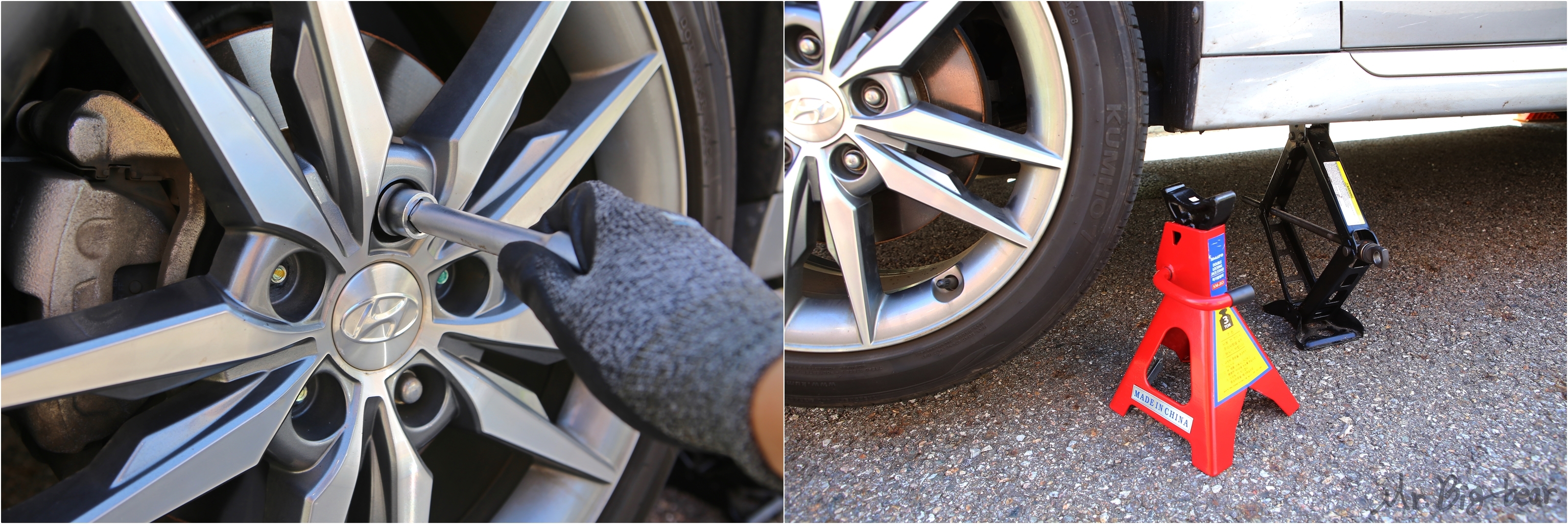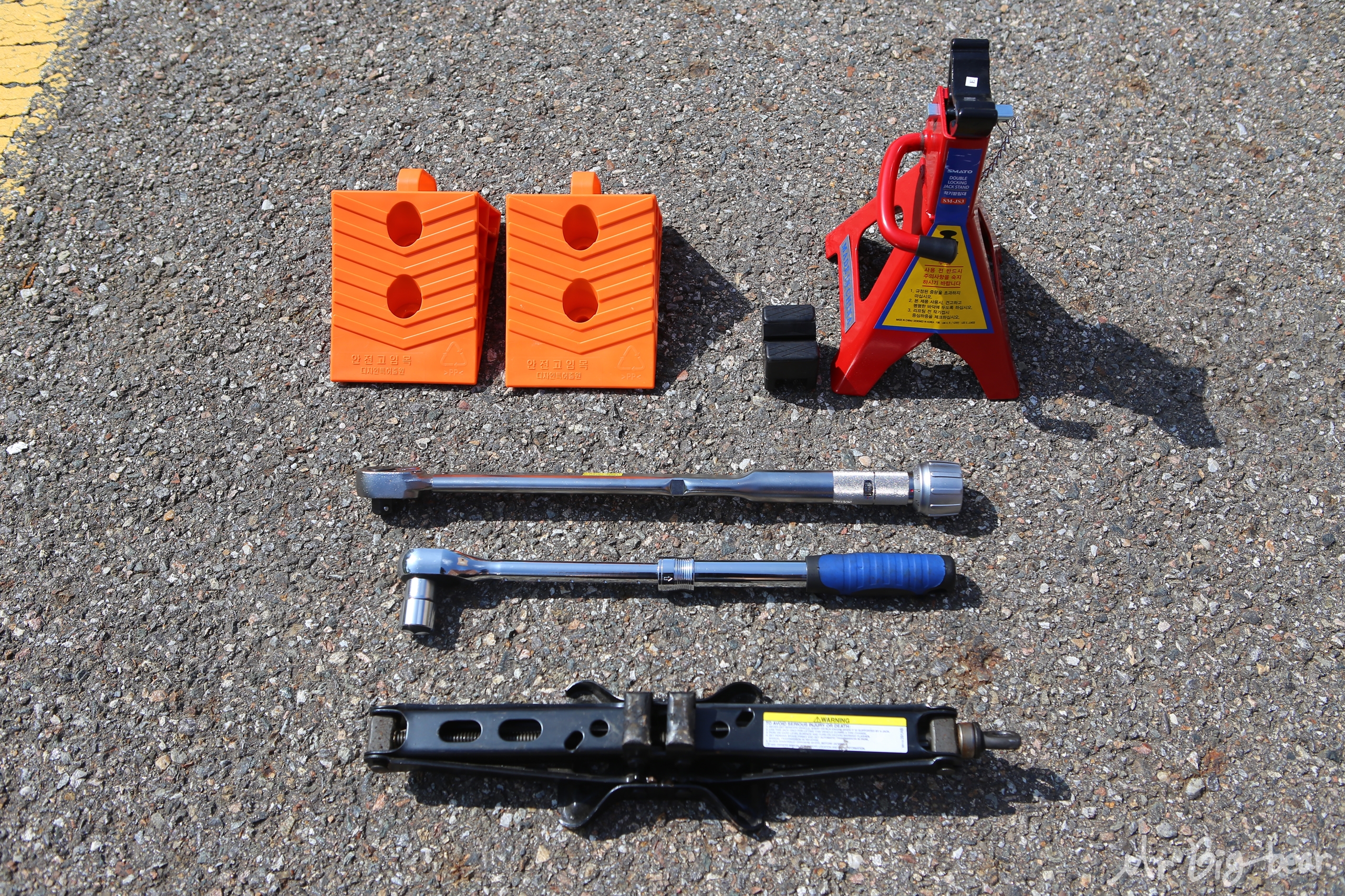 분명히 자키 사용법인데, 사진만 보셔도 준비물이 참 많죠? 유모차도 아니고 몇 톤씩 되는 차량을 들어올리는건데, 어설프게 자키만 사용하면, 내일이 없을 수도 있습니다. 검색해보셔도 자키로 자가정비하다가, 자키가 휘거나 무너지면서 아찔한 사고들을 쉽게 찾아보실 수 있습니다. 고로, 우리의 건강과 안녕을 위해 안전하게 작업하기 위해서는 고임목(2개), 말목 지지대(jack stand), 토크렌치, 길이조절 라쳇렌치(복스대) 그리고 자키가 필요합니다.