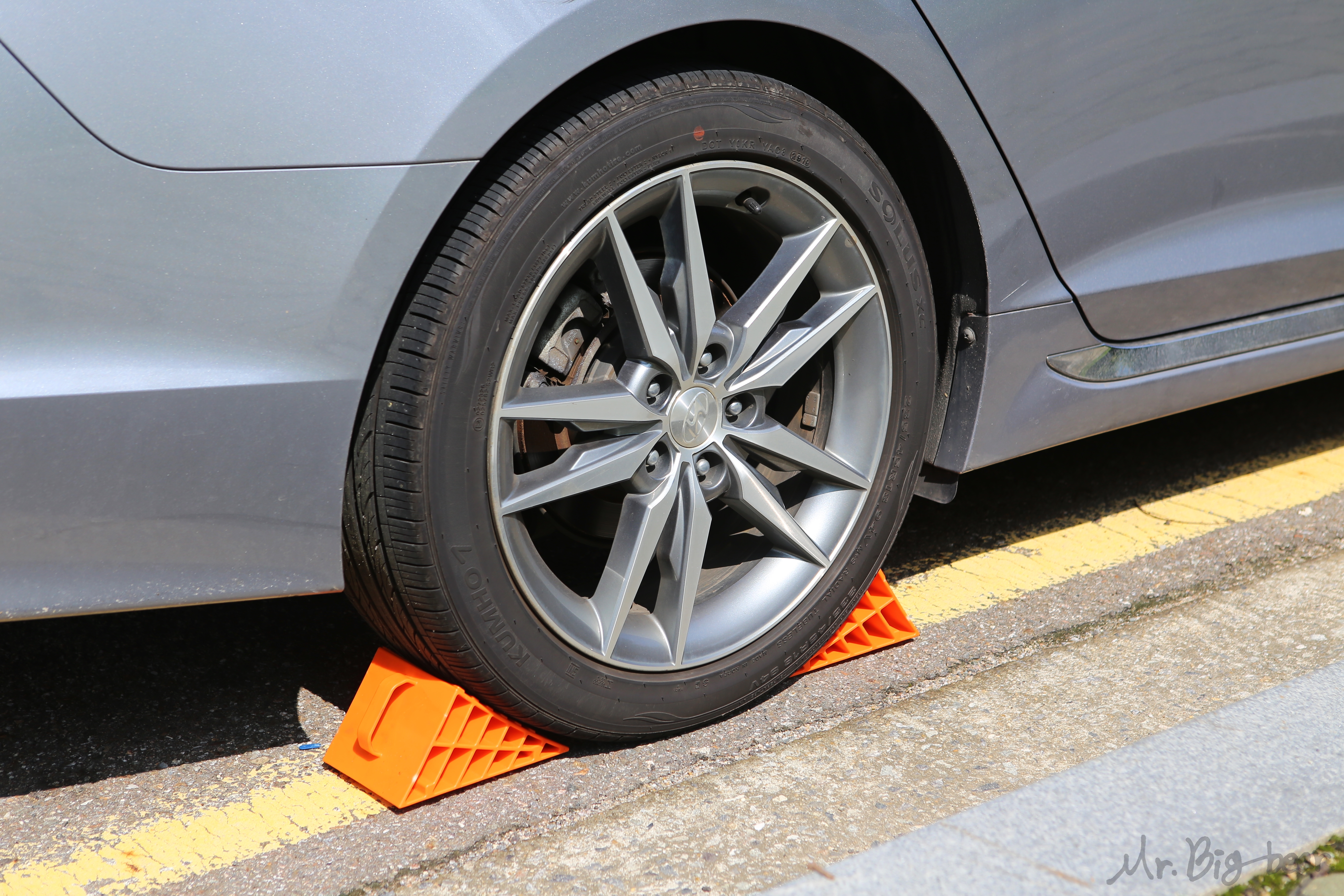 대각선 위치의 바퀴에 고임목 설치. 가장 어색한 준비물 중 하나가 고임목일 것 같습니다. 1년에 몇 번 경사로에 주차할 일이 없기에 벽돌로 바퀴에 받쳐본 적도 없고, 고임목이 있는 분들도 거의 없을겁니다. '평평한 곳에 주차하고, 파킹브레이크까지 잠궜는데 너무 과한거 아니야?' 라고 생각하실 수도 있지만, 사고는 예방이 제일 중요합니다. 대각선 위치에 있는 타이어에 앞/뒤 모두! 고임목을 설치해줍니다. 예를들어, 운전석쪽 앞바퀴를 탈거한다면 우측 뒷바퀴에 고임목 2개를 설치해줘야 합니다.