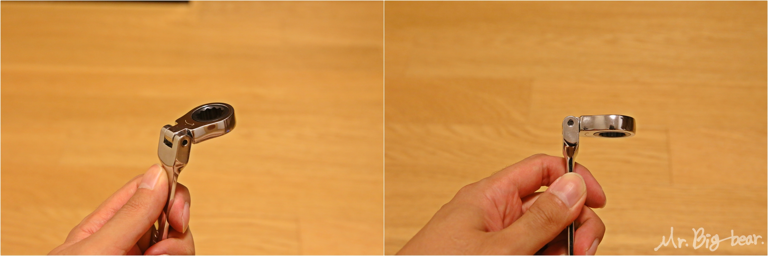 그 중에서도 라쳇은 각도가 90도 까지 휘어지는 '플렉시블' 타입입니다. 90도까지 꺾어서 사용할 경우는 거의 없지만, 원하는 각도까지 휘어지기 때문에 작업 공간이 협소한 곳에서 활용성은 최고입니다. 어차피 스패너를 구매하실 분들이라면 같은 크기(mm)에 양쪽 규격(오픈/라쳇)이 다르고 심지어 '플렉시블' 타입을 구매하시는걸 강추합니다.