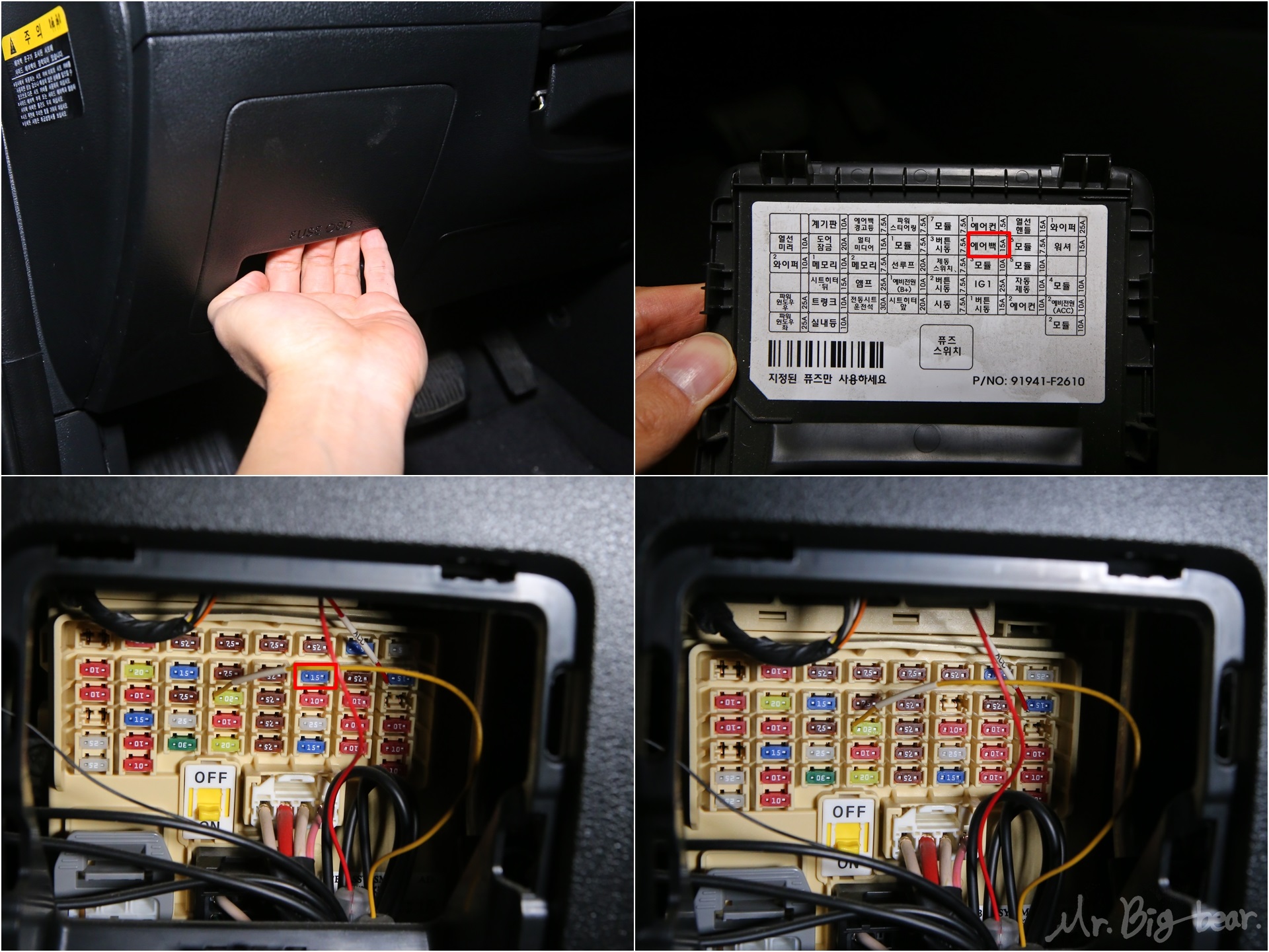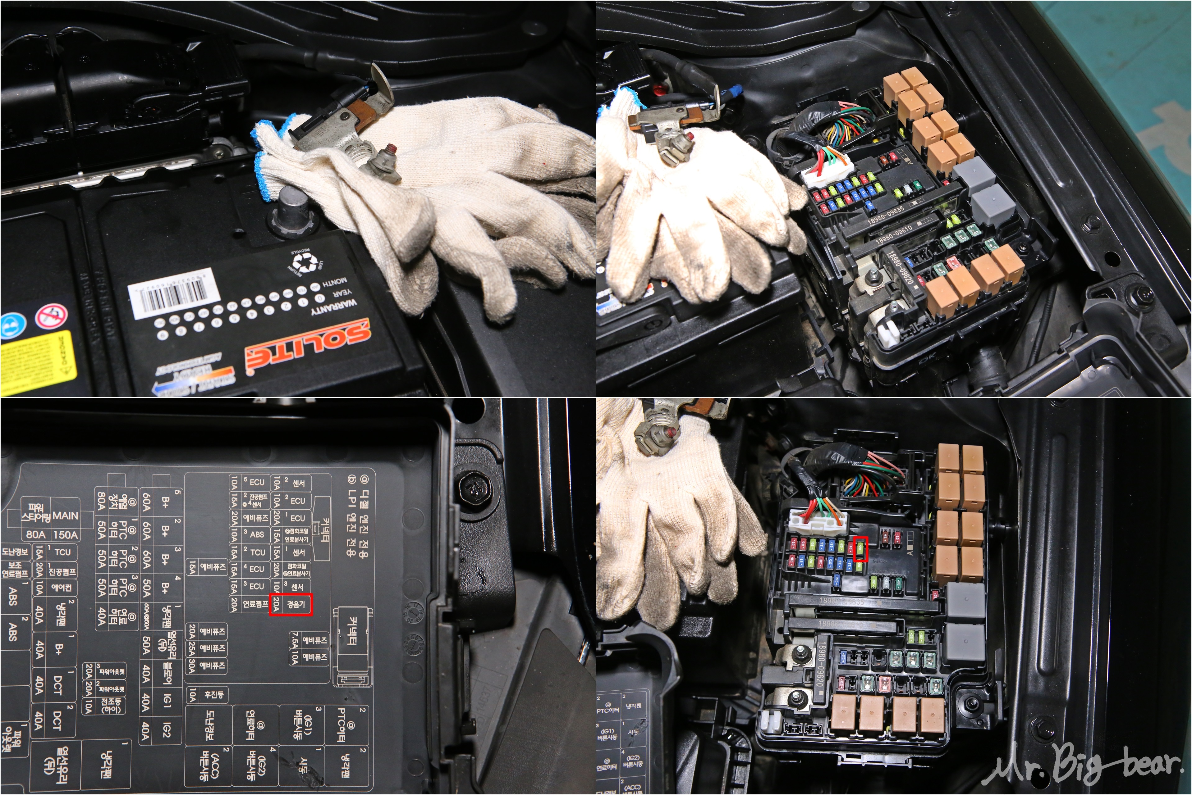 작업중 실내에서 탈거할 배선 커넥터가 몇가지 있으므로, 쇼트 방지를 위해 10mm 소켓으로 배터리 (-)단자부터 탈거해서 장갑 등 부도체에 올려줍니다. 조립시 경음기(크락션) 소리에 주변의 관심끌지 않도록, 배터리 옆에 있는 퓨즈박스에서 '경음기' 퓨즈를 탈거해줍니다. 퓨즈박스 뚜껑 뒷면에 보면 마법지도가 있으므로 참고하시면 됩니다.