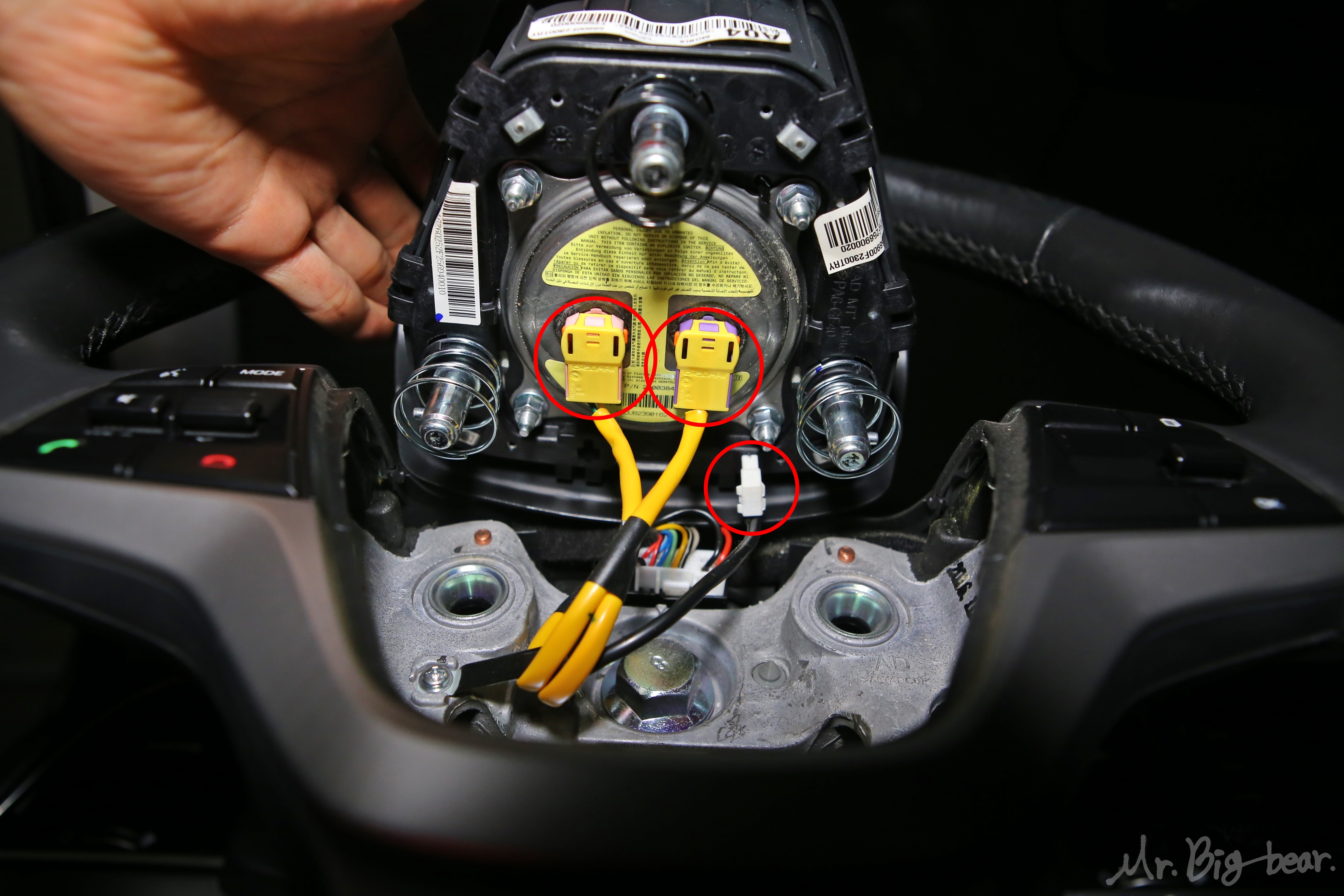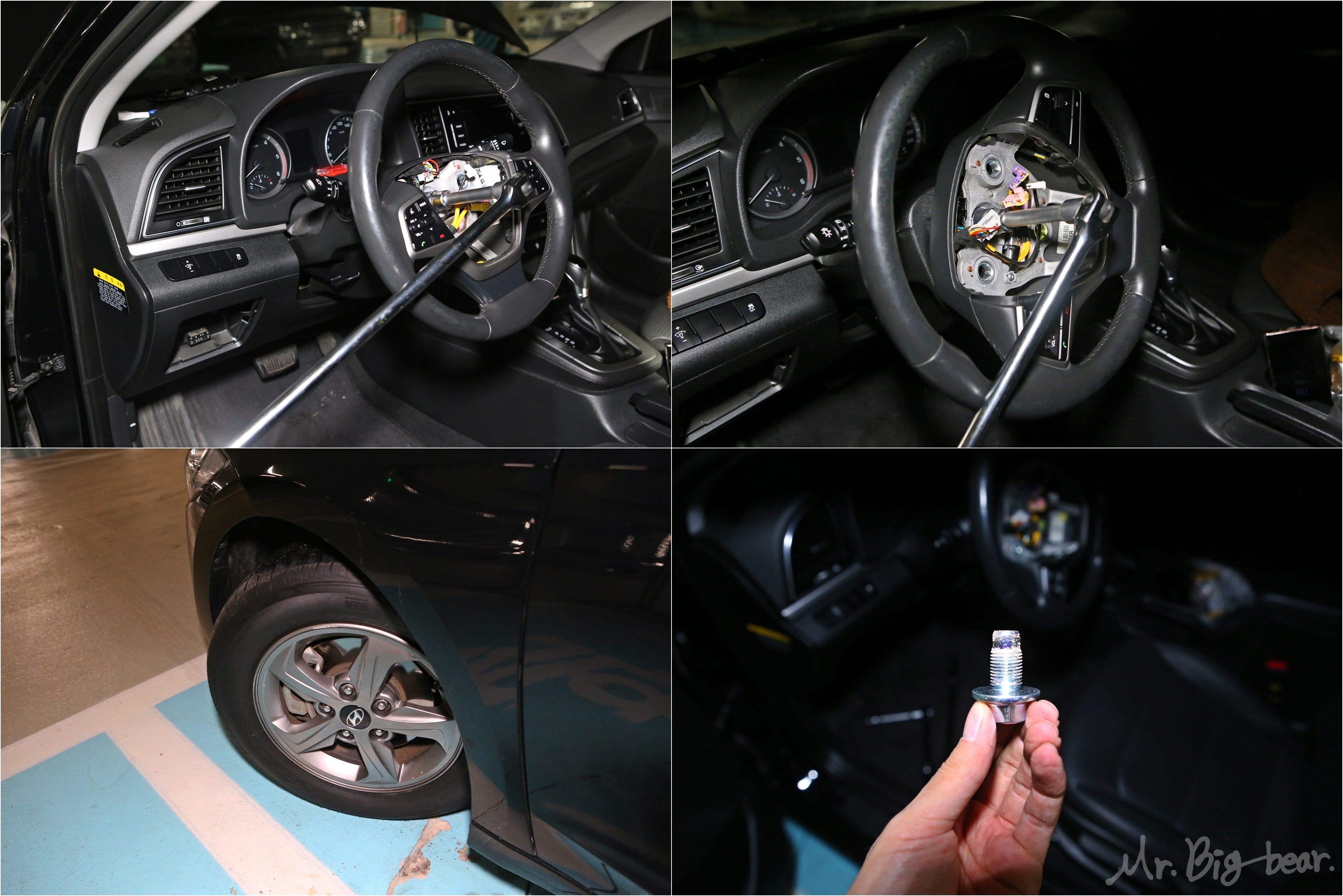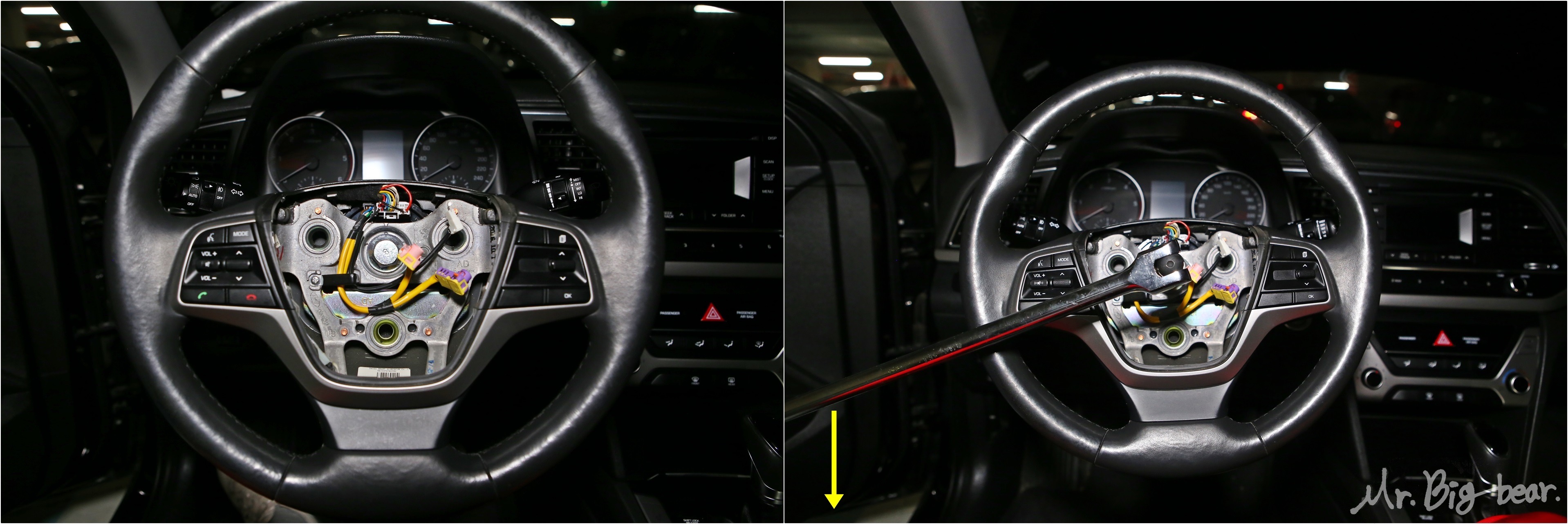 모든 준비가 끝났으므로, 운전석 에어백 및 핸들을 탈거할 차례입니다. 생각보다 운전석 에어백 탈거하는 방법은 매우 간단한데, 얇은 일자 또는 십자 드라이버만 있으면 됩니다. 핸들 뒷편 왼쪽/오른쪽/하단에 동일한 모양의 구멍이 있는데, 드라이버로 안쪽을 꾹 찔러주시면 '통' 하고 에어백이 밀려 나옵니다.