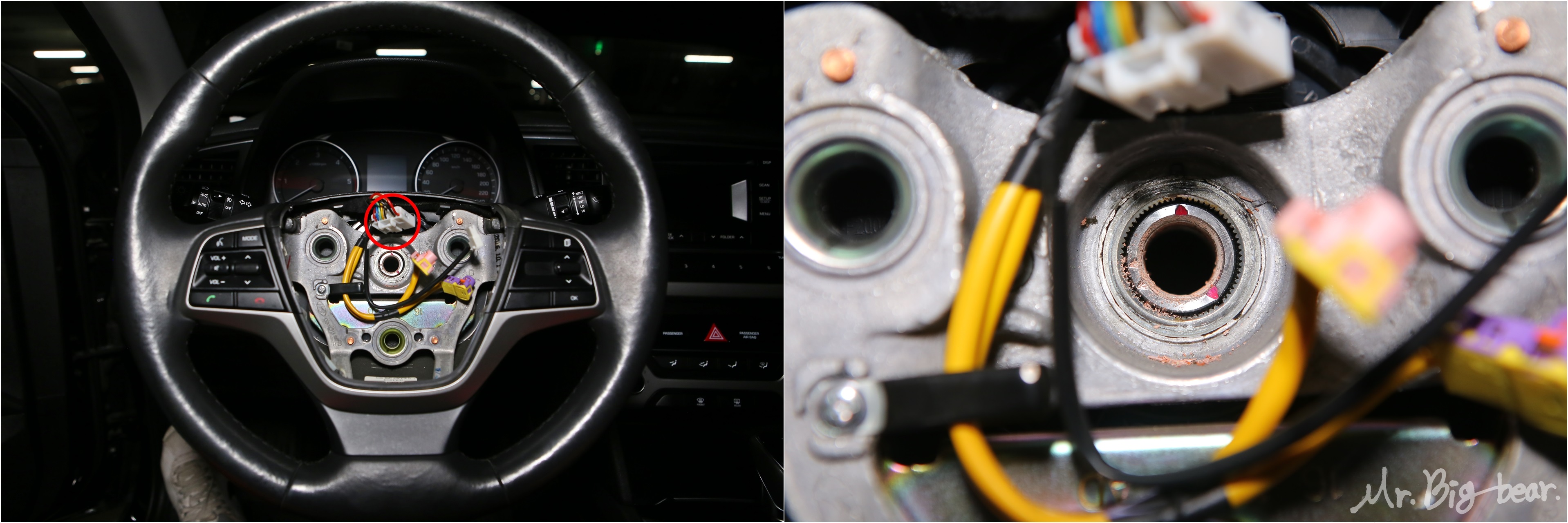 볼트를 풀었으면 다시 핸들을 센터로 정렬해주고, 상단의 커넥터를 탈거해줍니다. 에어백과는 별개로 상단 중앙에 흰색 커넥터가 1개 있으므로 이것만 뽑아주면 핸들이 쏙 하고 빠집니다. 아! 핸들을 탈거하기 전에 볼트 뺀 구멍을 자세히 보면 12시, 5시 방향에 빨간색 화살표와 홈이 있습니다. 나중에 조립할때 이 화살표와 홈을 일치시키지 않으면, 핸들이 정 중앙에 조립되지 않아 왼쪽/오른쪽 균형이 맞지 않을 수 있으므로 주의하시기 바랍니다.