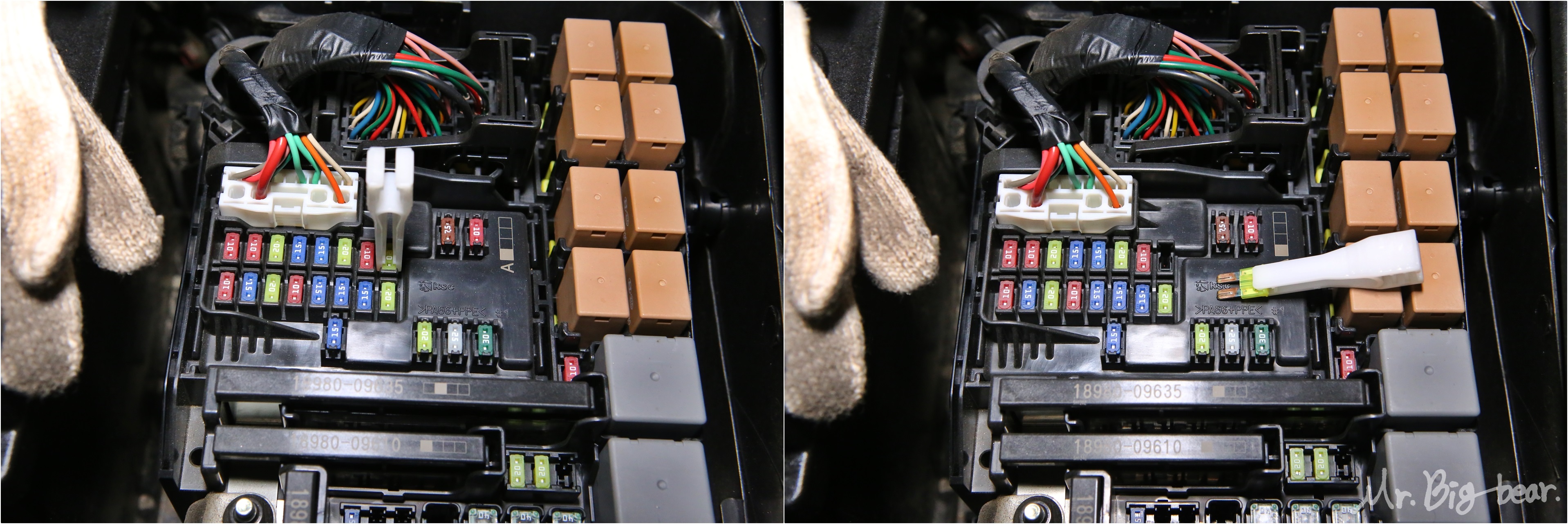 종종 퓨즈 빼기 어렵다고 롱노즈 같은 공구를 사용하시는 분이 있는데, 그럴 필요 없습니다. 퓨즈박스 안에 집게처럼 생긴 퓨즈 탈거용 전용 공구(?)가 들어있기 때문에, 사용하시면 쉽게 빠집니다. 탈거한 퓨즈는 절대 잃어버리지 않도록 근처에 잘 보관합니다.