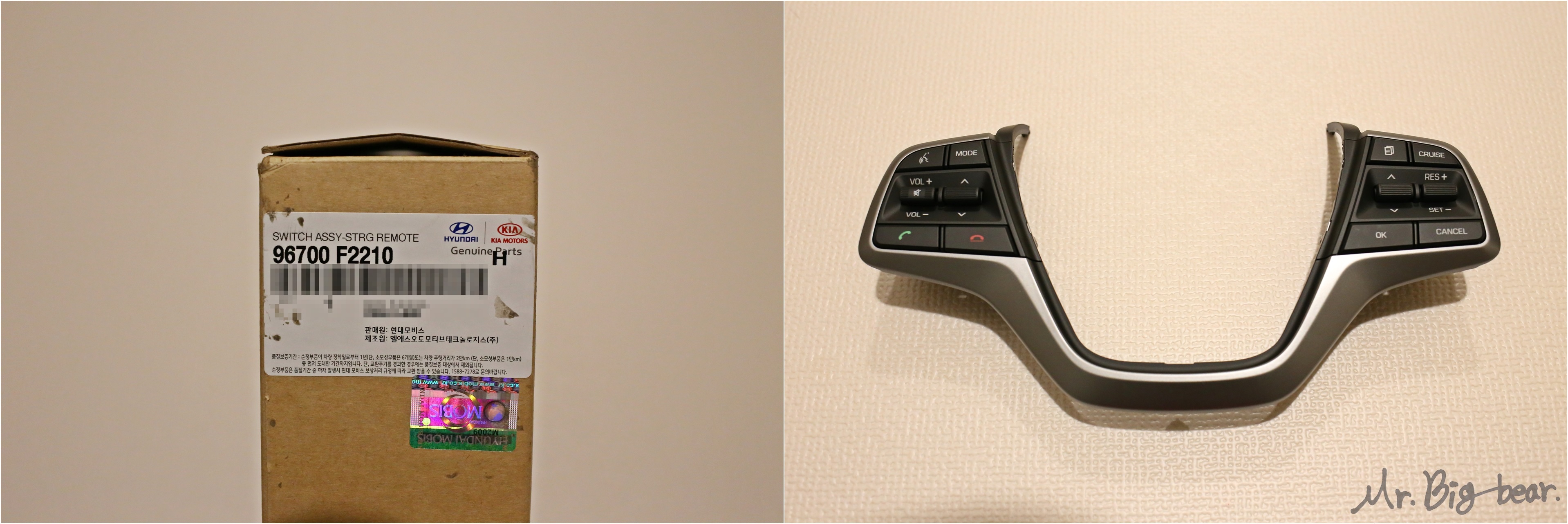 일단 크루즈컨트롤 버튼이 있는 순정 스위치 모듈이 필요합니다. 해당 파트넘버는 일명 삼각떼로 '페이스리프트' 전 아반떼AD만 해당되므로 착오 없으시기 바랍니다. 페이스리프트후 핸들의 디자인이 다소 변경되면서 스위치 모듈도 바뀌었습니다.