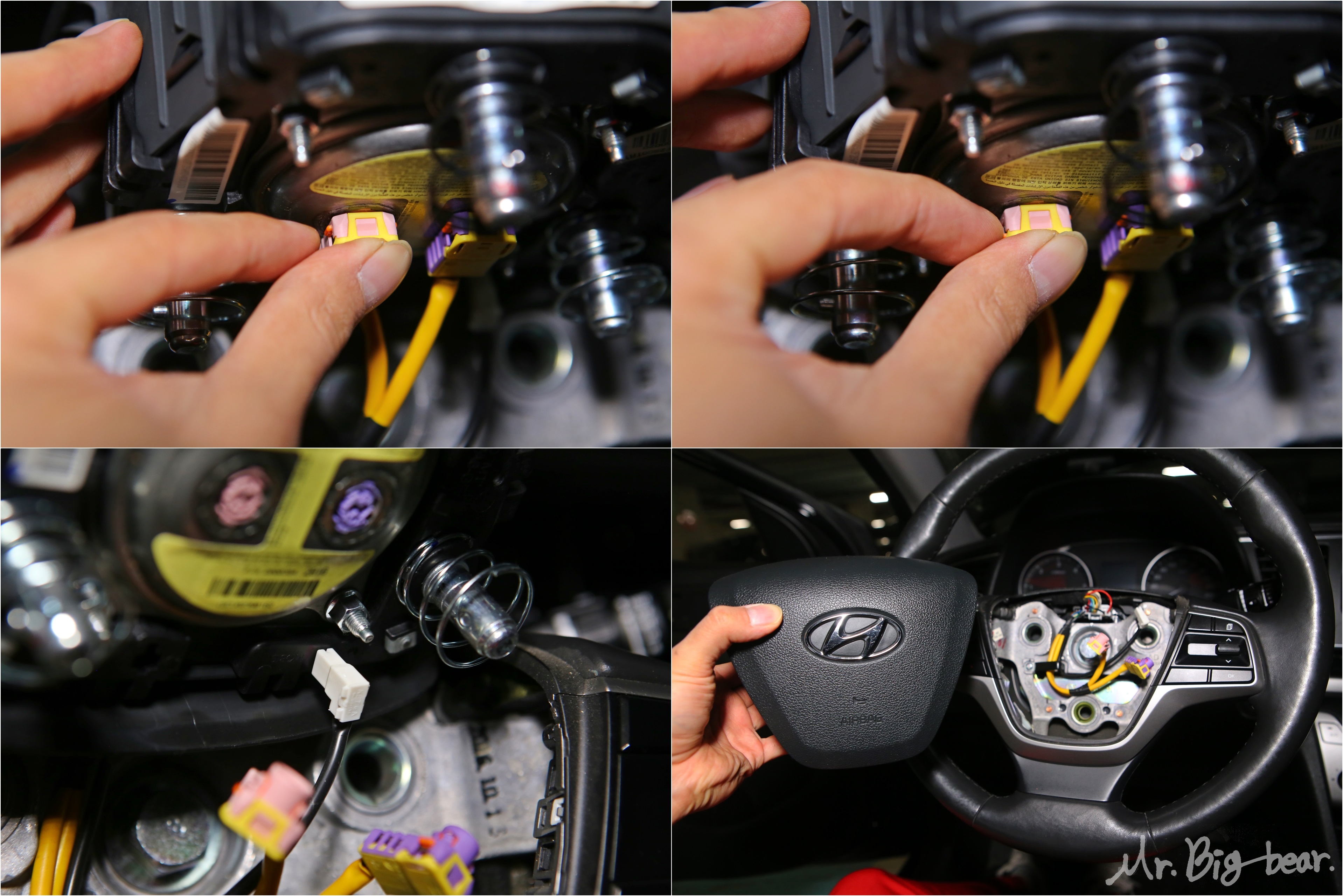 에어백 중앙에 연결된 2개의 쌍둥이 커넥터는 그냥 당기면 절대 빠지지 않습니다. 양쪽 측면에 '주황색' 레버가 있는데 왼쪽/오른쪽 모두 손톱으로 살짝 당기고 커넥터를 빼야 탈거할 수 있습니다. 흰색 커넥터는 별도의 레버가 없으므로 살짝 흔들어서 빼주면 쉽게 빠집니다. 그러면 여기까지 운전석 에어백을 완벽하게 탈거한 상태입니다.