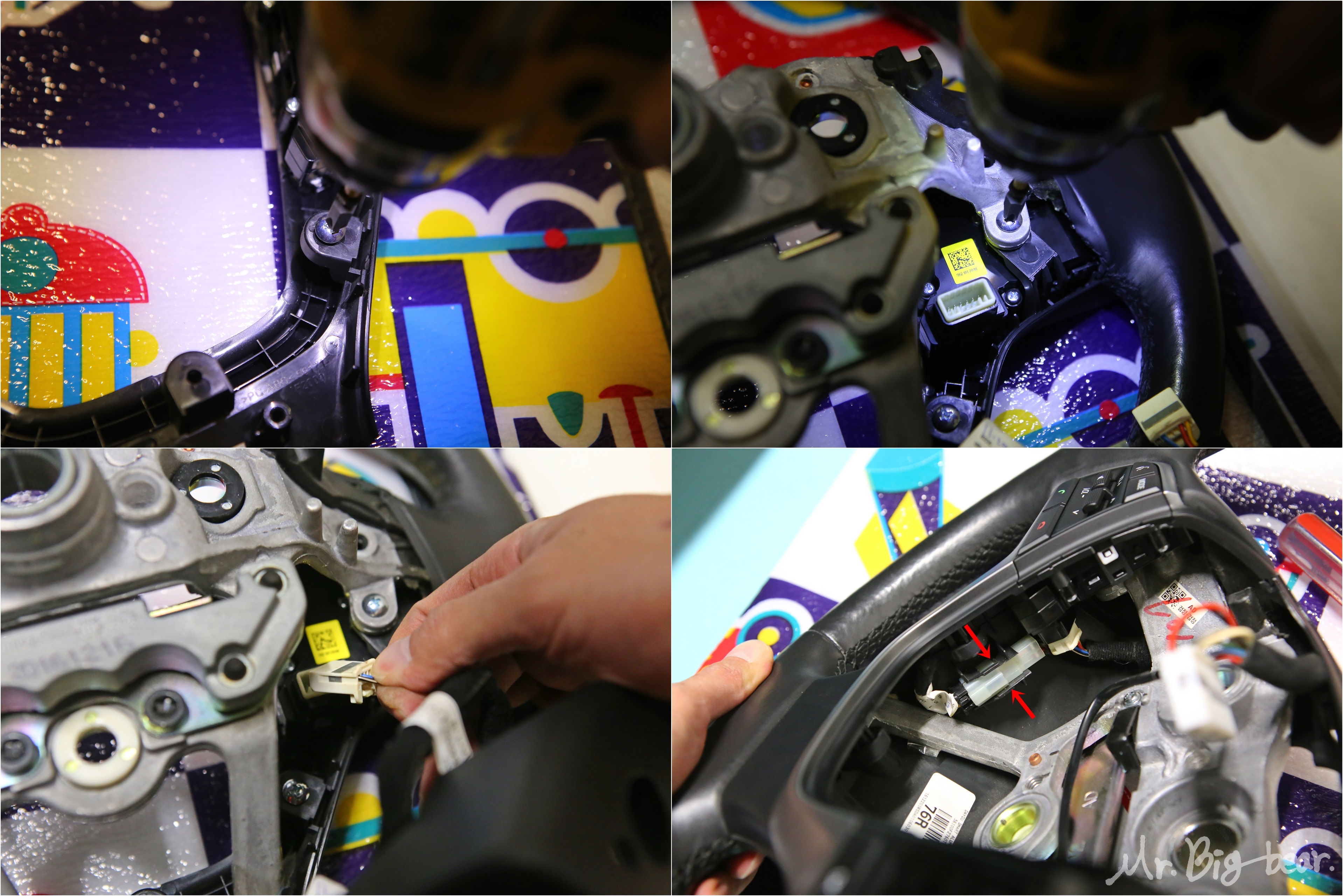 핸들 조립이 끝났으면, 운전석 에어백을 조립할 차례입니다. 왼쪽에 분홍색, 오른쪽에 보라색 커넥터를 끼워주되 사진처럼 주황색 레버가 딸깍 하면서 끼워지도록 끝까지 밀어줍니다. 주황색 레버가 중간에 있는 상태로 조립되면 끝까지 덜 삽입된 상태이므로, 주행중 이탈될 수 있습니다. 커넥터를 잘 끼워주고, 에어백 조립시 배선이 씹히지 않도록 배선을 안쪽으로 잘 밀어넣으면서 눌러주면 툭 하면서 고정됩니다.