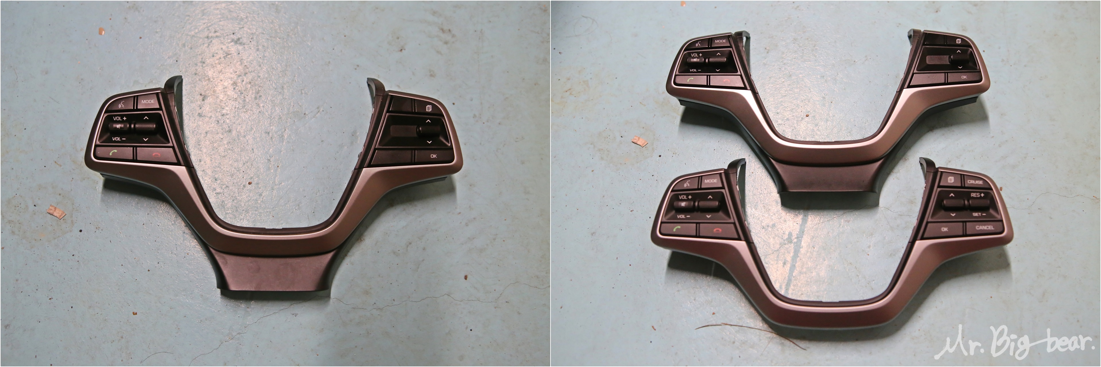 마지막으로 크루즈컨트롤 스위치 모듈로 교환하기 전/후 모습입니다. 오른쪽 스위치 더미 부분에 크루즈컨트롤 관련 버튼이 가득찬게 보기 좋네요.