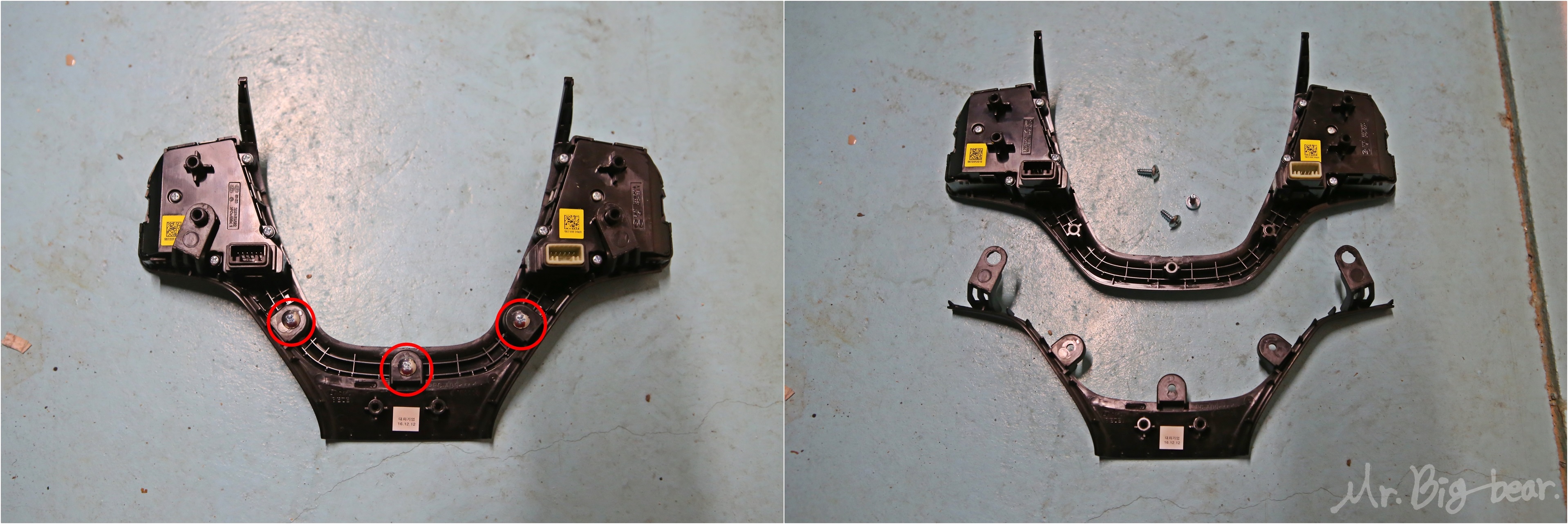 운전석에서 탈거한 핸들(스티어링휠)을 작업하기 편하게 밝은 곳으로 갖고 나옵니다. 핸들 뒷면의 십자 피스 4개만 풀면 플라스틱 커버가 분리됩니다. 그리고 분리된 안쪽 좌/우를 살펴보면 핸들의 스틸 프레임과 스위치 모듈을 고정시키는 피스가 1개씩 있습니다. 이 2개의 피스까지 풀어주면 스위치 모듈이 완전히 분리됩니다.